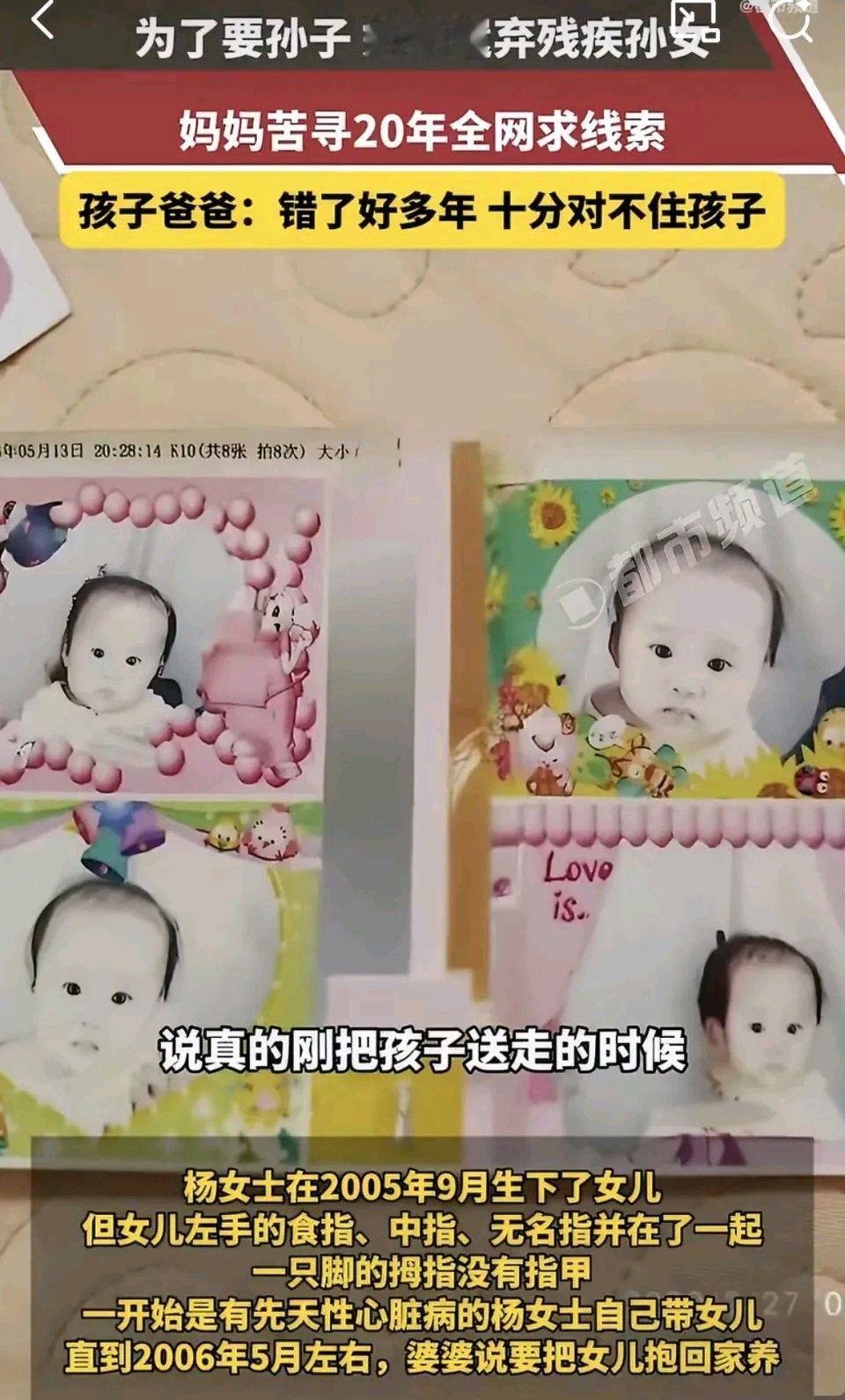 这事儿真让人愤怒!广东杨女士顶着先天性心脏病风险生下女儿,就因为孩子有点小残疾,婆婆竟联合儿子把8个月大的孙女扔在路边。2006年婆婆骗杨女士说抱回老家照顾,多年后才吐露实情。 杨女士这些年没睡过安稳觉,一心寻女,而当年参与遗弃的丈夫如今虽醒悟,但伤害已造成。从法律上讲,负有扶养义务却遗弃年幼子女,情节恶劣就构成遗弃罪,最高可判五年有期徒刑。这悲剧根源就是重男轻女思想。孩子何其无辜,母亲何其可怜,真希望早日找到孩子,让这苦寻20年的母亲得偿所愿。