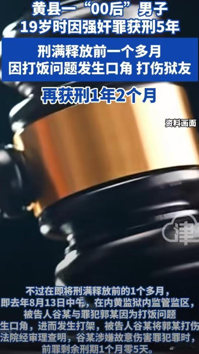 河南安阳,19岁小伙因侵犯一名女孩获刑5年,原本还有一个月就刑满释放了,可小伙在打饭时和狱友发生口角,三拳两脚将对方打成轻伤二级。结果悲剧了,小伙因故意伤害罪再次获刑。 据红星新闻、津云报道,谷某是个00后,内黄县人士。 2021年,刚刚19岁的谷某因犯强奸罪被判处有期徒刑5年。 服刑期间,谷某积极改造,还获得了7个月的减刑。 原本2025年9月17号,谷某就可以刑满释放了,可8月13号发生了一件事,导致谷某再次获刑。 案发当天中午,谷某在食堂打饭时,因为一点小事和罪犯郭某发生了口角。 此前谷某就和郭某有点不对付,这次摩擦两人都没压住火气,刚吵了两句,就演变成了打架。 谷某年轻力壮,拿起铁餐盘就往郭某头上打去,现场一片混乱。 武警立即过去制止二人,可短短一会时间,郭某已经被打得头破血流,后经鉴定,郭某达到了轻伤二级。 谷某涉嫌故意伤害罪,再次成了被告。此时,离谷某出狱只有1个月零5天。 谷某服刑期间又犯故意伤害罪,他会受到什么处罚?刑期应该如何计算? 谷某在食堂打饭时与郭某发生口角后,拿起铁餐盘往郭某头上打去,导致郭某轻伤二级。 根据《刑法》第二百三十四条规定,故意伤害他人身体的,致人轻伤的,构成故意伤害罪。 谷某在与郭某发生摩擦后,未能控制情绪,使用铁餐盘对郭某实施了伤害行为,造成了郭某轻伤二级的后果,符合故意伤害罪的构成要件。 因此,一审认为,谷某故意伤害郭某身体,构成故意伤害罪。 谷某原本因强 奸 罪被判处有期徒刑5年,服刑期间获得了7个月的减刑,原计划2025年9月17日刑满释放。 2025年8月13日,谷某又犯新罪,此时距离出狱仅有1个月零5天,那么,此时谷某的刑期应该如何计算? 对于这种刑期未满又犯新罪的情况,应依据《刑法》第七十一条的规定来计算刑期。 该条规定:判决宣告以后,刑罚执行完毕以前,被判刑的犯罪分子又犯罪的,应当对新犯的罪作出判决,把前罪没有执行的刑罚和后罪所判处的刑罚,依照本法第六十九条的规定,决定执行的刑罚。 具体到谷某案,首先要确定前罪没有执行的刑罚,谷某原判刑期5年,减去已获得的7个月减刑,截至2025年8月13日,前罪剩余未执行的刑期为1个月零5天。 然后,法院会对谷某新犯的故意伤害罪作出判决,假设法院判处谷某有期徒刑1年,接下来,就要按照第六十九条的规定决定执行的刑罚。 第六十九条规定了数罪并罚的原则,判决宣告以前一人犯数罪的,除判处死刑和无期徒刑的以外,应当在总和刑期以下、数刑中最高刑期以上,酌情决定执行的刑期。 在谷某的案件中,就是要在1年1个月零5天以下、1年以上,酌情决定最终执行的刑期。 因此,一审认为,谷某犯故意伤害罪,因谷某前罪未执行完又犯新罪,应数罪并罚。 因谷某案发后如实供述自己的犯罪事实,自愿签署认罪认罚具结书,庭审中认罪态度较好,有悔罪表现,依法可从宽处理。 最终,谷某因故意伤害罪获刑1年2个月,与前罪1个月零5天并罚,决定执行有期徒刑1年2个月。