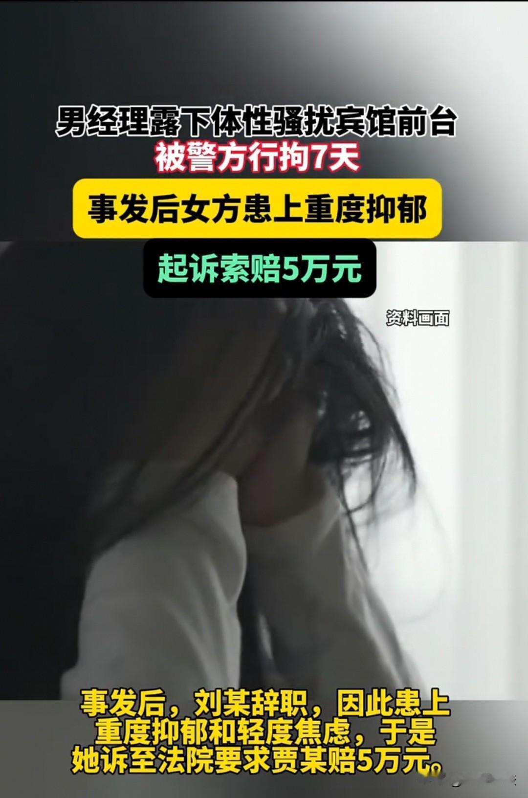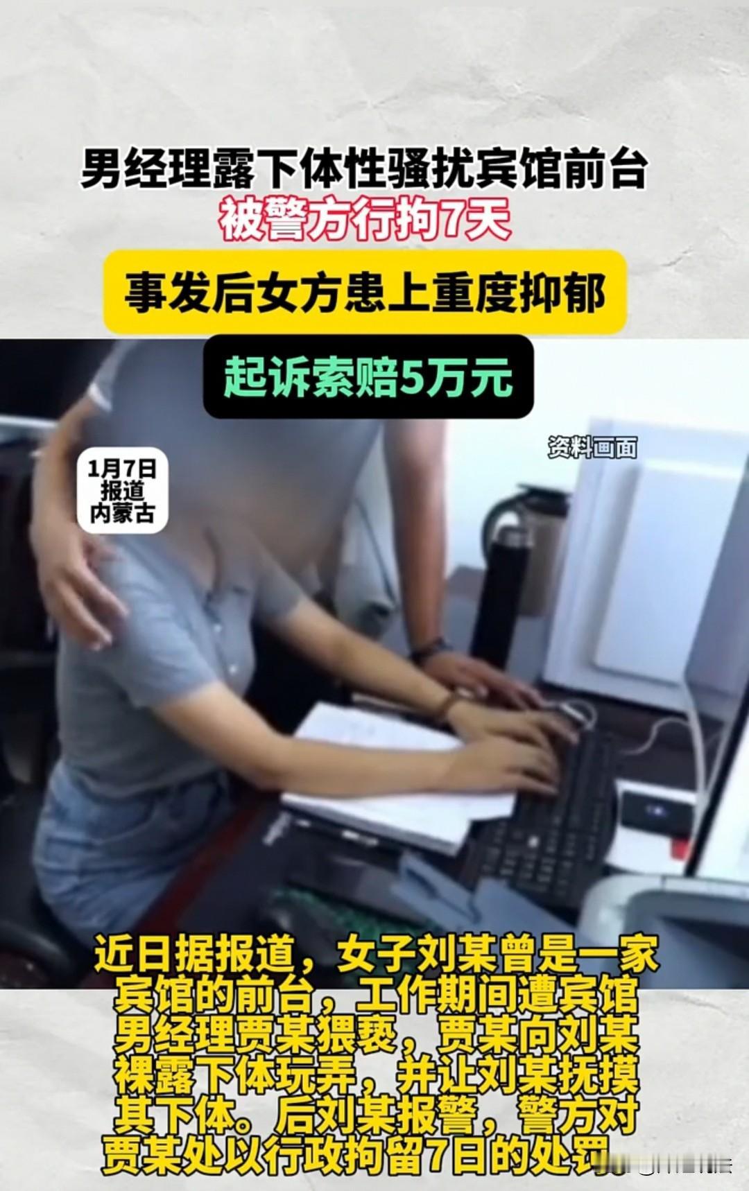 内蒙古,一宾馆前台,因家境困难,怕丢工作,在遭到男经理裸露下体,进行骚扰时被迫顺从。事后,她内心非常煎熬,决定报警,经理也被行拘七日。女子因为此事患上了重度的抑郁,怎么也无法恢复正常的生活,她便提起诉讼,要求经理赔偿5万元。 (来源:综合媒体报道,2026年1月7日) 刘某家境一直不好,日子过得紧巴巴的。这份宾馆前台的工作,是她好不容易找的一个稳定的活,打心底里珍惜。 每个月的工资,要交房租,要应付日常开销,还得攒点钱,防着家里出点急事。所以上班从来都是小心翼翼,半点差池都不敢出。 她性子本就懦弱,不爱跟人争,也不爱跟人吵。在宾馆上班,不管是遇着客人刁难,还是同事的小为难,她都默默忍下来。心里就一个念头,别惹事,只要保住这份工作就好。 宾馆经理贾某,平时在店里架子大得很,对员工总是呼来喝去。刘某向来躲着他走,可躲来躲去,还是没躲过那场噩梦。 那天轮到刘某值夜班,凌晨的宾馆大厅,静悄悄的,店里就她和贾某。贾某说要巡查工作,愣是一直留在店里没走。 一开始,他只是在前台附近走来走去,偶尔问两句工作上的事。见刘某一直低着头,不敢跟他对视,他的手脚,就开始不规矩起来。 先是随手拍了拍刘某的肩膀,刘某只是缩了一下,没敢反抗。贾某的胆子就更大了,突然走到她面前,裸露了下体,还硬逼着她伸手去摸。 那一刻,刘某脑子一片空白,整个人都僵住了。她想喊,想推开他,可手刚碰到贾某的胳膊,脑子里就闪过房租单,空空的钱包,还有家里的开销。 家境不好,丢了工作就没了收入,根本活不下去。这份恐惧,捆住了她的手脚,懦弱的性子,也让她没了反抗的勇气。最后,她只能顺着贾某的要求,木然地照做了。 贾某走后,刘某瘫坐在前台椅子上,眼泪止不住地掉。她看着自己的手,只觉得脏,胃里一阵恶心,跑到卫生间干呕半天,啥也没吐出来。 那一夜,她守着冷冷的前台,眼睛盯着监控,无数次想拿起电话报警。可手指碰到按键,又被“丢了工作就活不下去”的念头拽住,最后还是把手机放下了。 从那之后,刘某的日子,就陷进了阴霾里。每天上班,只要看到贾某的影子,她就控制不住地发抖。晚上躺在床上,那晚的画面,一遍遍在脑子里转,压根睡不着觉。 她吃不下饭,体重一天天往下掉。原本就不爱说话的人,变得更孤僻了,连跟人对视都不敢,总觉得别人看她的眼神不对劲。 她咬着牙硬撑着上班,可精神上的折磨,终究是扛不住了。有一次,贾某故意走到前台跟她搭话,只是靠近了一点,刘某当场就崩溃大哭起来。 她这才明白,就算保住工作,自己也会被这份屈辱和恐惧逼疯。终于在一个清晨,刘某翻出当晚的监控录像和工作记录,手抖着拨通了报警电话。 警方很快就介入调查,贾某因为猥亵他人,被行政拘留7天。可这迟来的处罚,压根抚不平刘某心里的伤。 她精神状态太差,实在没法上班,只能辞职。每天把自己关在出租屋里,后来去医院检查,被确诊为重度抑郁伴轻度焦虑。 躺在病床上,刘某看着天花板,心里只有一个想法,就算家里再难,就算自己再懦弱,也不能让欺负自己的人,一点代价都不付。 她不能让自己的尊严,就这么被随意践踏。最终,她决定起诉贾某,让他为自己的行为承担民事赔偿责任,用法律给自己讨一个公道。 根据《治安管理处罚法》第四十四条,猥亵他人的,处5日以上10日以下拘留。 贾某裸露下体还强迫刘某抚摸,妥妥构成了猥亵,警方对他行拘7天,完全符合法律规定。 《民法典》第一千一百八十三条也有明确规定,侵害他人人身权益,造成严重精神损害的,被侵权人可以要求精神损害赔偿。 刘某因为这次猥亵,直接患上了抑郁和焦虑,精神伤害摆在眼前。 法院结合贾某的过错程度,还有刘某的实际损害,判决贾某赔偿1万元,这个结果其实挺合理的。 面对这场因懦弱和生活窘迫引发的职场伤害,你怎么看?