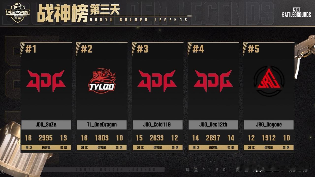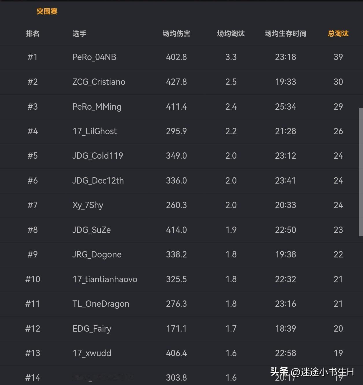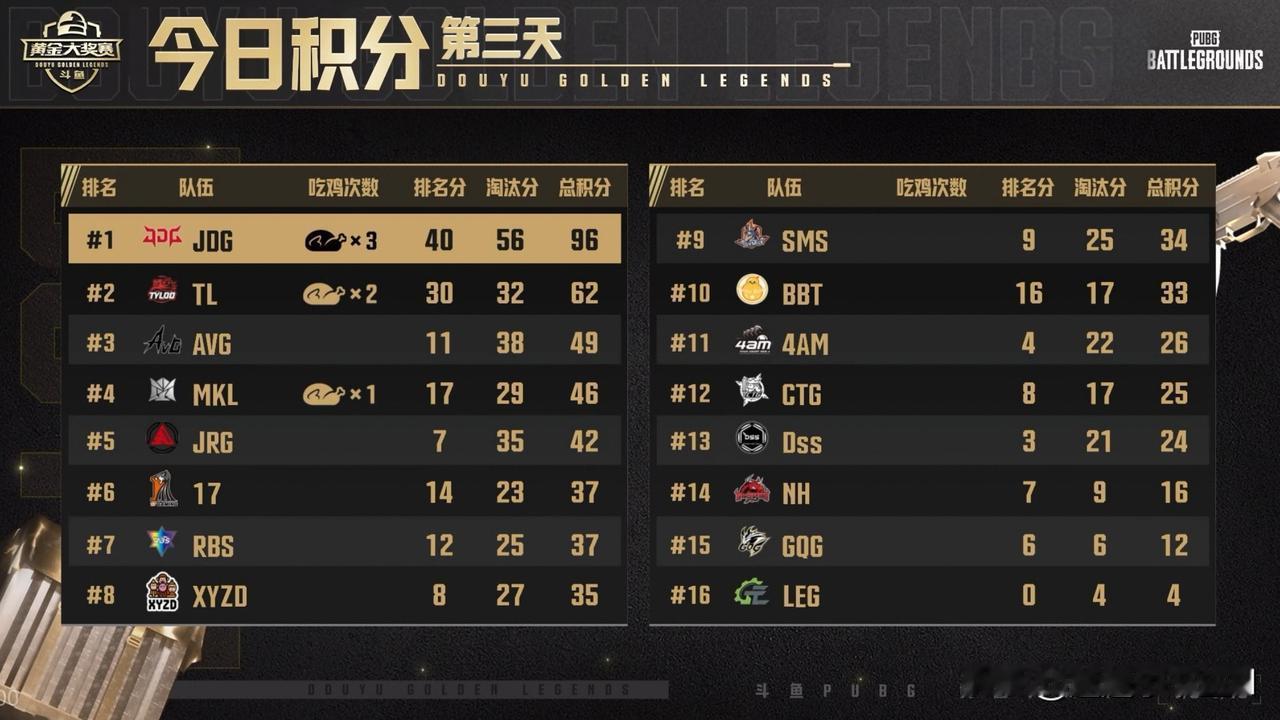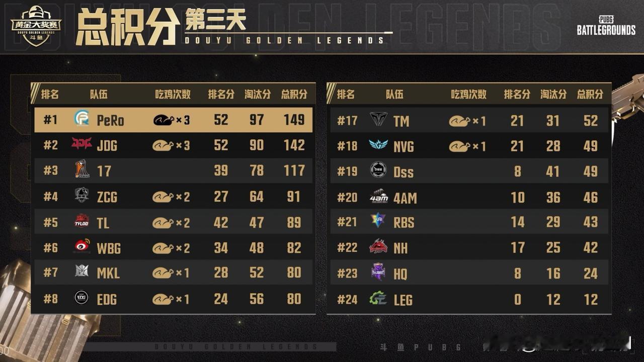 4AM止步小组赛! 黄金大奖赛小组赛三天比赛结束! PeRo第一、JDG第二、17第三、ZCG第四 04NB以12场39个淘汰领衔小组赛战神榜 从小组赛的积分来看,今年可能是飘柔、JDG、17三足鼎立的局面,这三个队伍都是进行了阵容的升级,目前看升级成功,17唯一表现不足的就是新阵容在小组赛没有吃鸡表现 4AM新阵容在24进16的小组赛中表现不佳,止步小组赛,幻神、shen、太空人、温蛋四个人的实力还是可以的,但在一起就是没打好,这么玩感觉情况不妙,今年又是无希望!