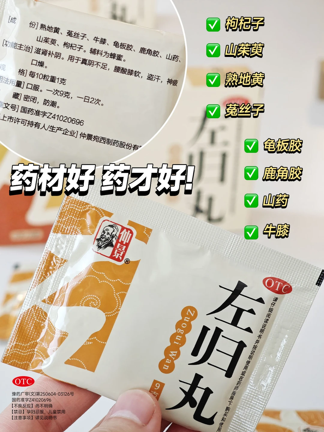 ✅仲景作为大品牌,用料真的很讲究!别看它小小一包,里面含有熟地黄、山茱萸、菟丝子、枸杞子、牛膝、山药等八味中药材,还添加了龟板胶和鹿角胶这类补益力强的成分,在补阴的同时也不会伤阳。