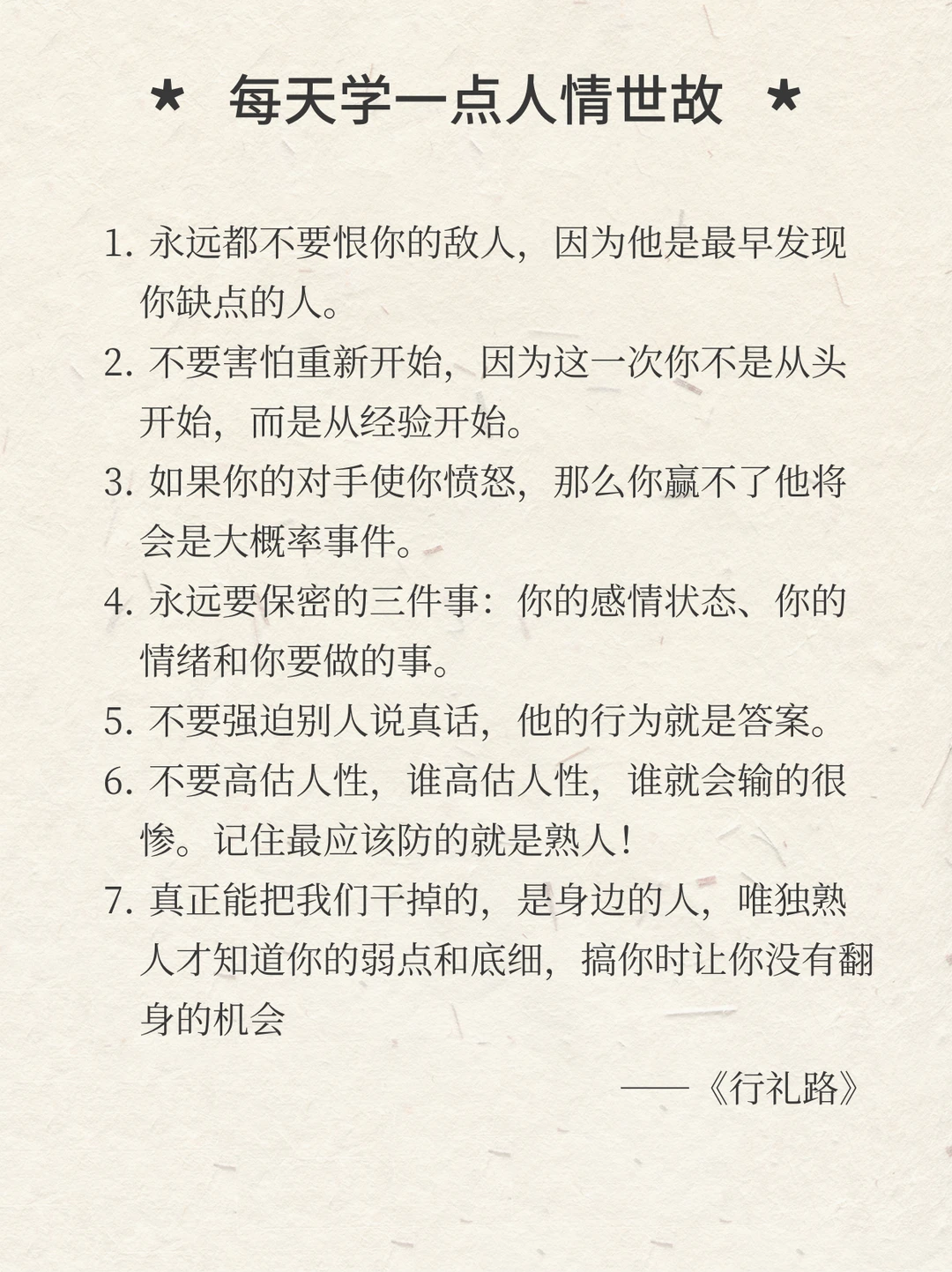1.永远都不要恨你的敌人,因为他是最早发现你缺点的人。 2.不要害怕重新开始,因为这一次你不是从头开始,而是从经验开始。 3.如果你的对手使你愤怒,那么你赢不了他将会是大概率事件。 4.永远要保密的三件事:你的感情状态、你的情绪和你要做的事。 5.不要强迫别人说真话,他的行为就是答案。 6.不要高估人性,谁高估人性,谁就会输的很惨。记住最应该防的就是熟人! 7.真正能把我们干掉的,是身边的人唯独熟人,才知道你的弱点和底细,搞你时让你没有翻身的机会。