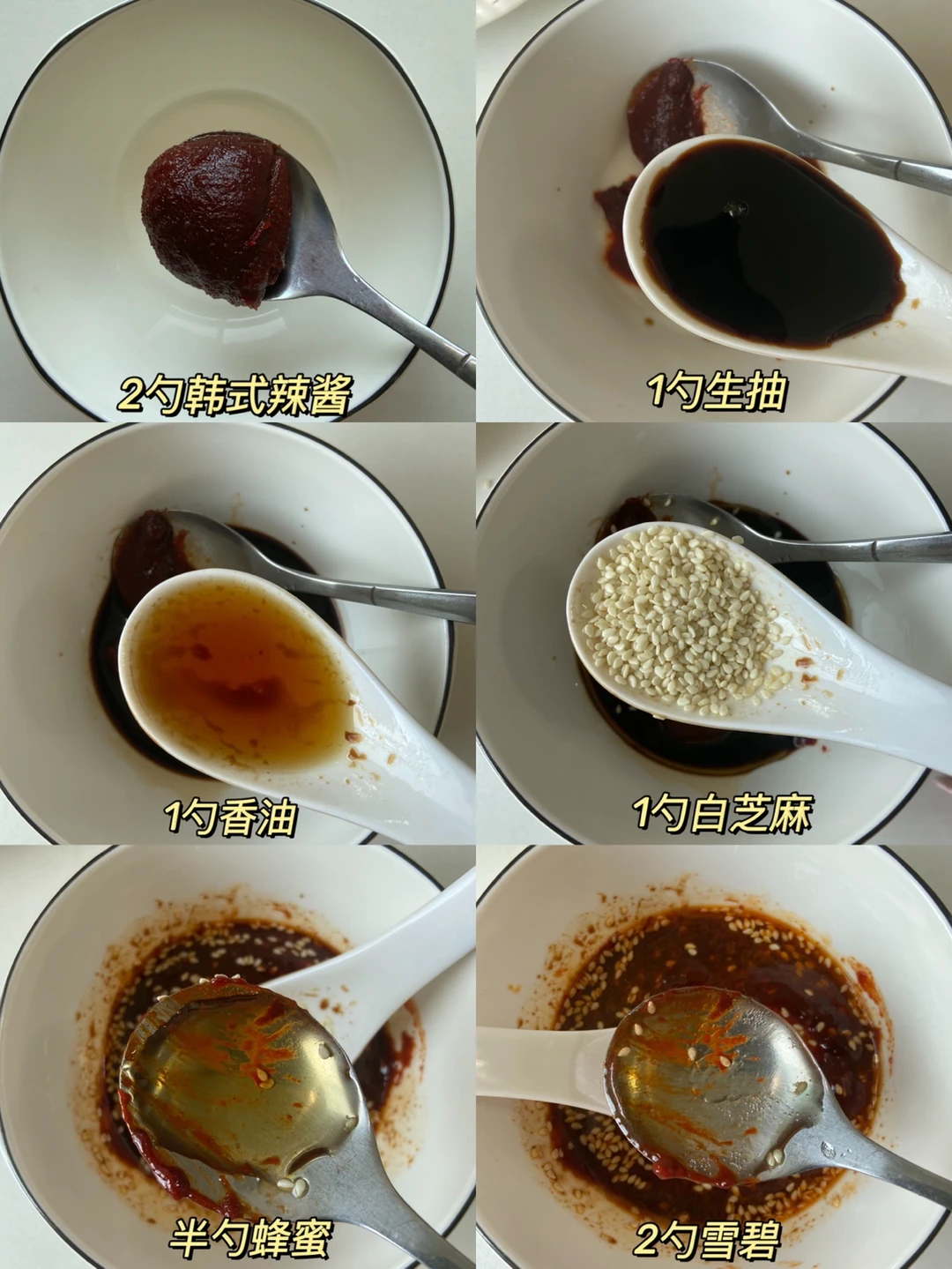 1️⃣先调个酱汁:2勺韩式辣酱➕1勺生抽➕1勺香油➕1勺白芝麻➕半勺蜂蜜➕2勺雪碧搅拌均匀备用