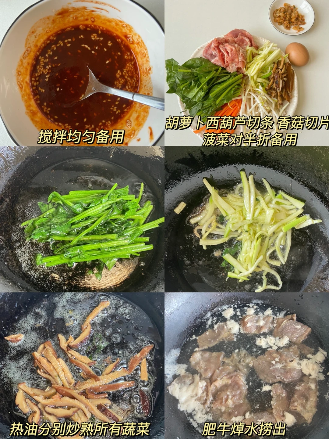 3️⃣热油分别炒熟所有蔬菜 肥牛焯水捞出 煎个溏心蛋