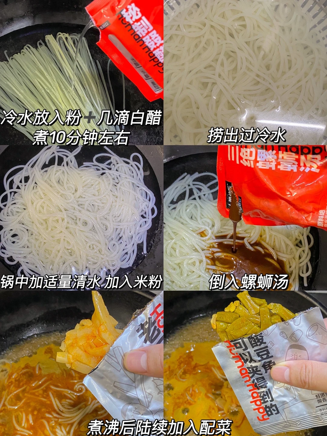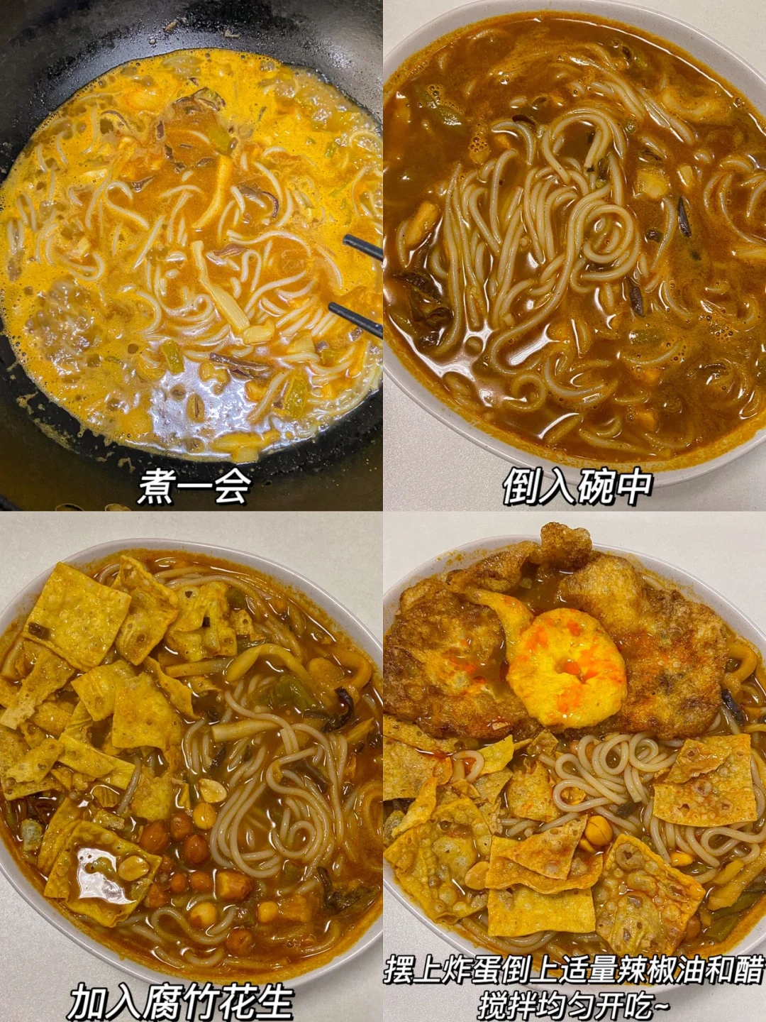 每个星期都要吃一次螺蛳粉的我 把家里的囤货全清空了 忍了几个星期还是没忍住😂入了坠近狠🔥的人类快乐螺蛳粉🍜到手马上煮了 配上炸蛋真的绝绝子‼️ 做法✨✨✨✨✨ 1️⃣鸡蛋蛋黄蛋清分离 蛋清用筷子搅打至发白起泡 锅中加油油温热倒入蛋清 蛋清成型放入蛋黄 翻面炸一下夹出来控油备用 2️⃣冷水放入粉➕几滴白醋煮10分钟左右捞出过冷水 3️⃣锅中加适量清水 加入米粉倒入螺蛳汤 煮沸加入配菜煮一会装碗 放上腐竹花生 炸蛋即可✔️ 螺蛳汤是坠绝之处👍🏻狠香浓鲜美 能感觉出是高汤熬制的 不像调料粉多的吃了口渴 再放上炸蛋🍳吸满汤汁 真的巨赞👍🏻 . 还有头一次吃过像薯片那么大片的腐竹 倒入汤里3秒就吸满了汤汁 松软入味好满足~😌黄澄澄的米粉滑溜溜的 吸满了汤汁狠Q弹 敲好嗦搭配上葱香辣椒油 就更香了😌料包超足 一大碗太解馋了 这就是螺蛳粉天花板!!!~爱吃螺蛳粉的宝们可以试一试🤓