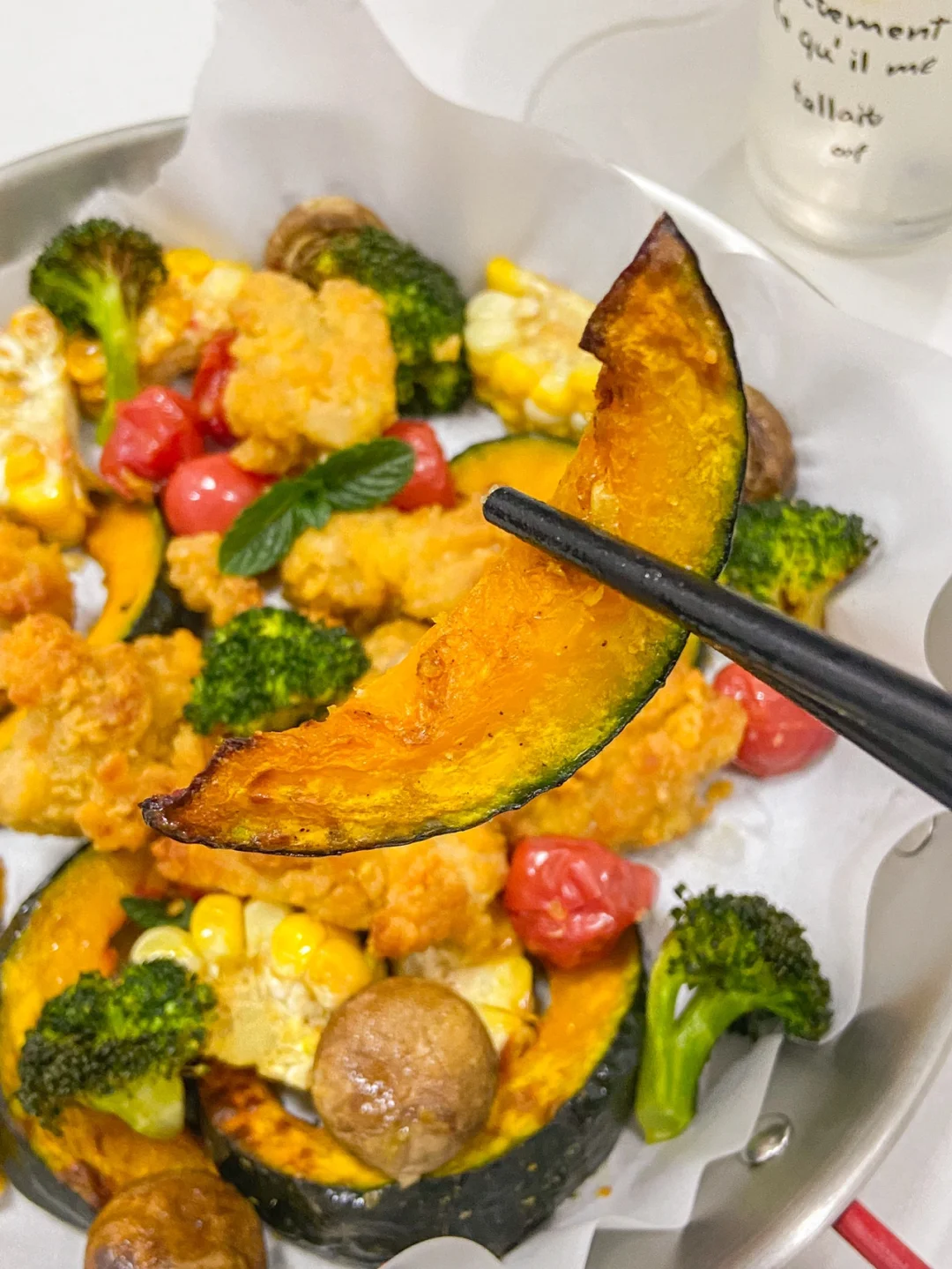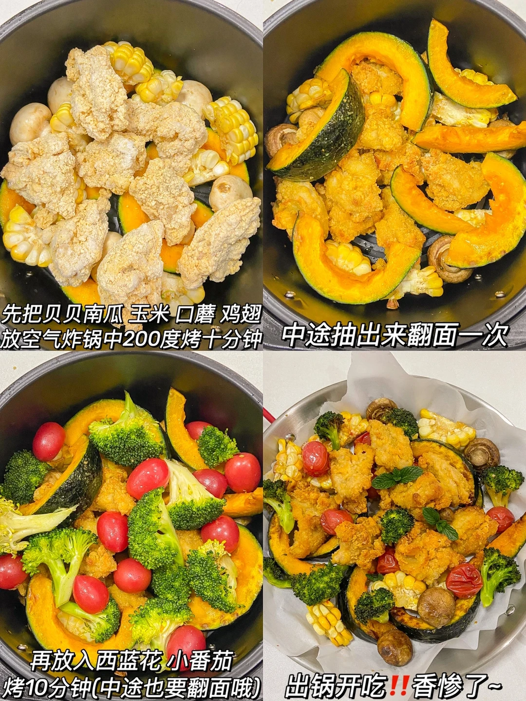 2️⃣先把贝贝南瓜 玉米 口蘑 鸡翅放空气炸锅中200度烤十分钟(中途抽出来翻面一次)