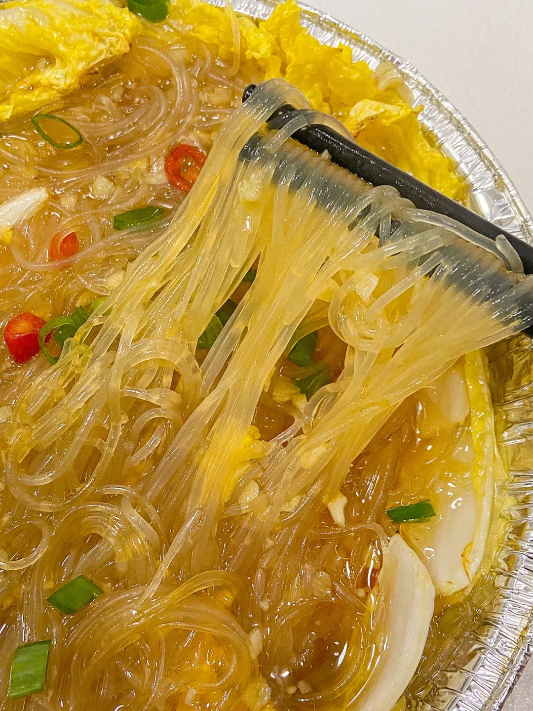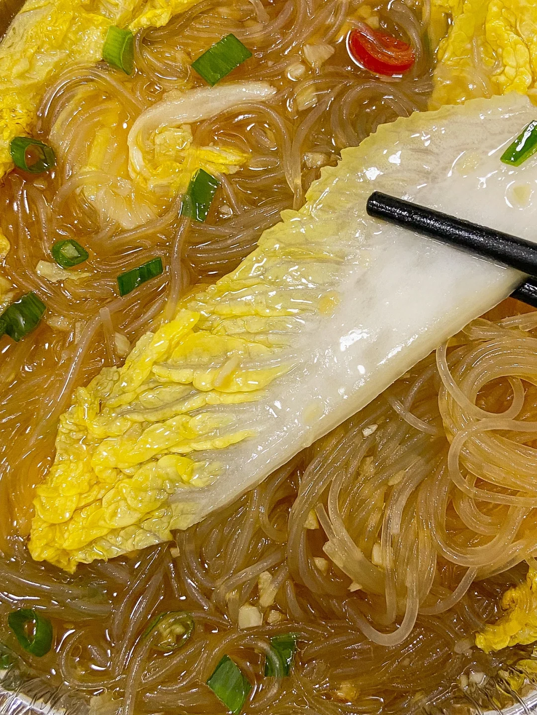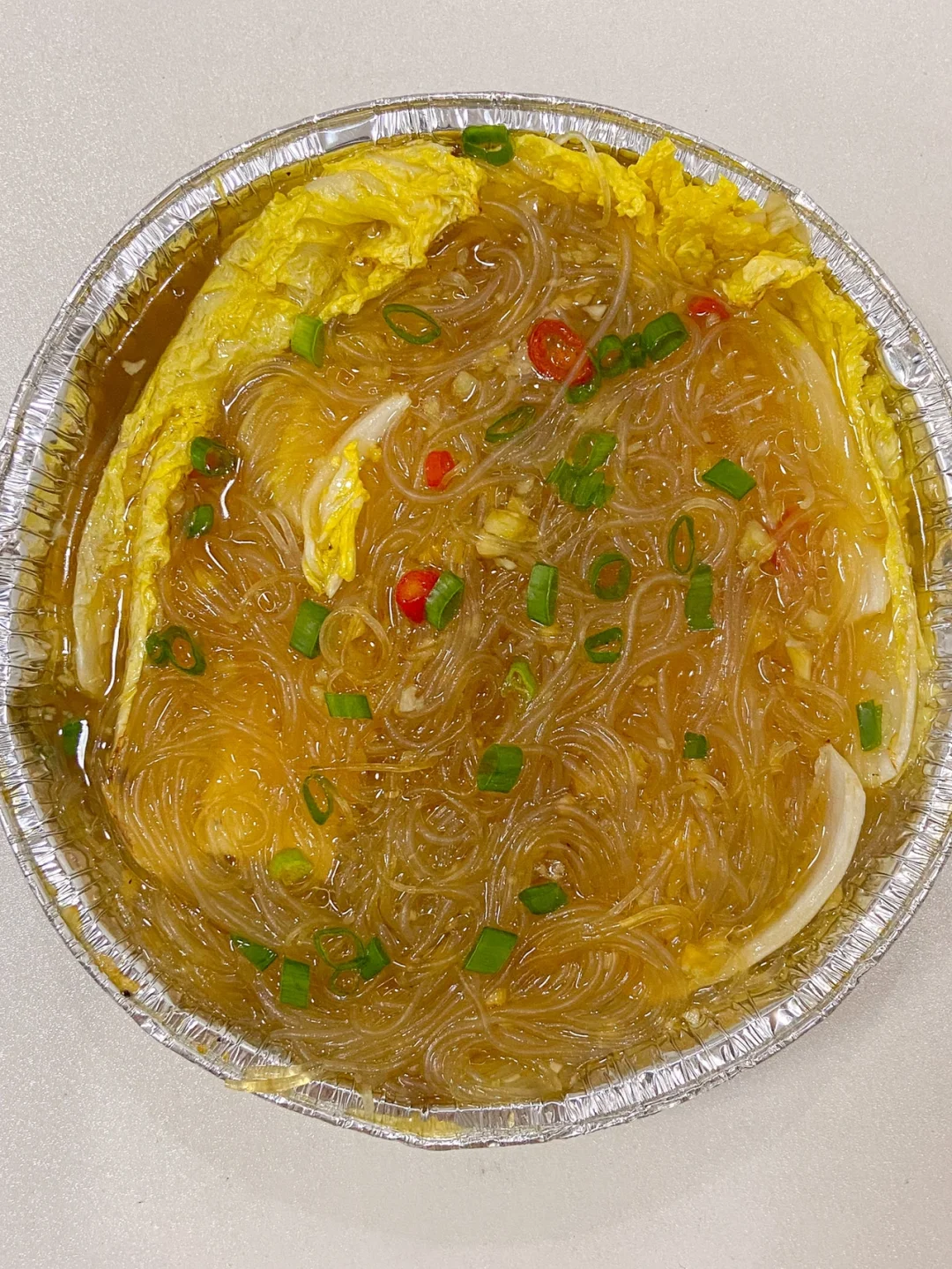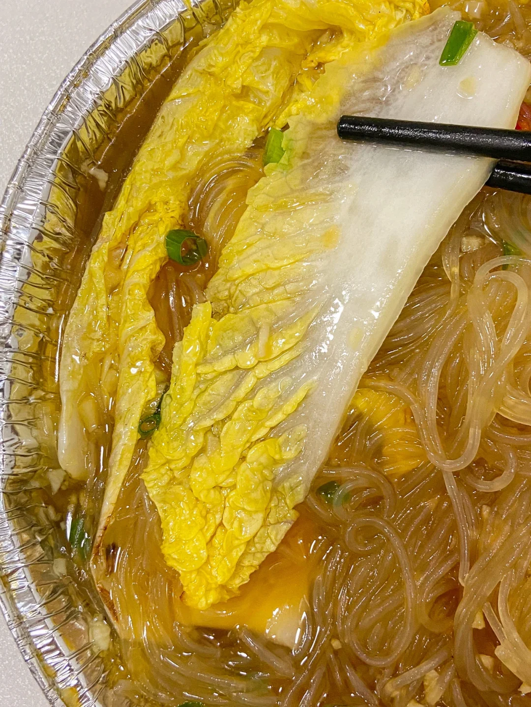 2️⃣粉丝泡软 锡纸碗娃娃菜铺底(娃娃菜可以先焯水)铺上泡软的粉丝 倒入开水没过食材 倒入调好的酱汁 上面裹上锡纸密封