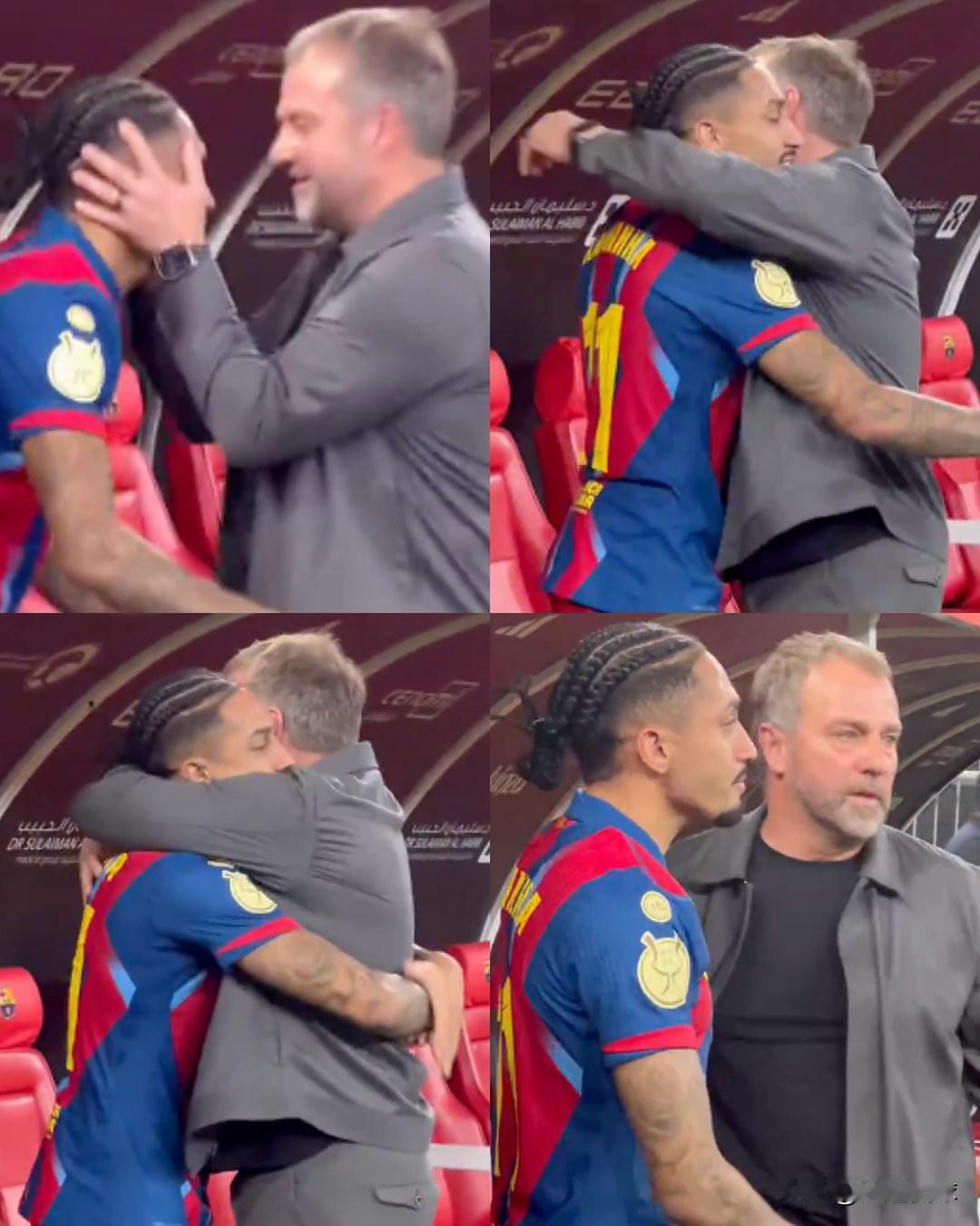 西班牙超级杯决赛后的感人一刻!就在巴萨庆祝夺冠正酣时,弗里克悄然离开人群,径直走向拉菲尼亚,拉菲刚刚在巴萨又一场决赛中当选全场最佳球员。 当众人高呼出售巴西人时,是弗里克选择了信任;当质疑声包围球员时,是弗里克递出队长袖标;正是这位教练的到来,彻底改变了拉菲尼亚的职业生涯。何等连贯的信任啊!两人相视时涌动的情绪,已然说明了一切。