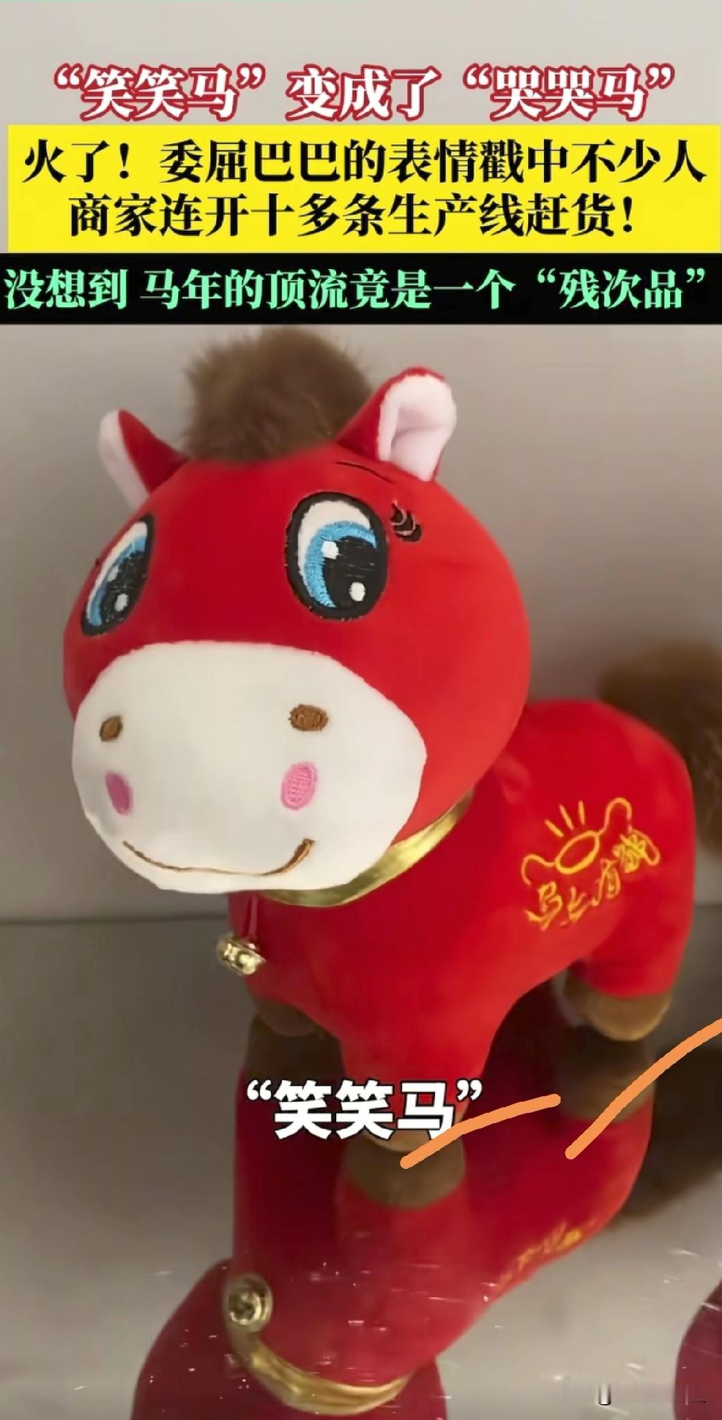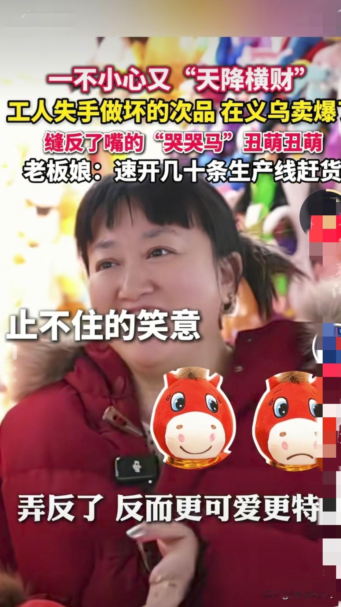 这是一个美丽的错误!真是运气来了挡都挡不住,做梦都会笑醒。 近日,义乌一家玩具厂的老板娘就遇上了这样的“天降横财”。 原本工人在生产毛绒马玩偶时失手,把嘴巴缝反了,成了一个个耷拉着嘴角、看起来委屈巴巴的“哭哭马”,这些本应被销毁的次品,老板娘舍不得浪费,抱着试试看的心态拿到市场低价清仓,没想到却意外戳中了年轻人的审美。 这种“丑萌”的独特造型迅速在网络上走红,订单像雪片一样飞来,工厂不得不紧急开设几十条生产线连夜赶货。 有网友评论:“这哪里是次品,分明是隐藏款!” 还有人说:“有时候不完美才是最大的完美,这波反向操作太绝了。” 更有网友调侃:“求老板娘给工人加工资,这可是‘金点子’啊!” 这个因失误诞生的“哭哭马”,不仅让工厂起死回生,还成了现象级爆款,也让大家看到,生活中的小意外,有时反而能开出意想不到的花。 你身边有过这样“因祸得福”的事吗? 毛绒马玩偶 马到成功玩偶 生肖马公仔