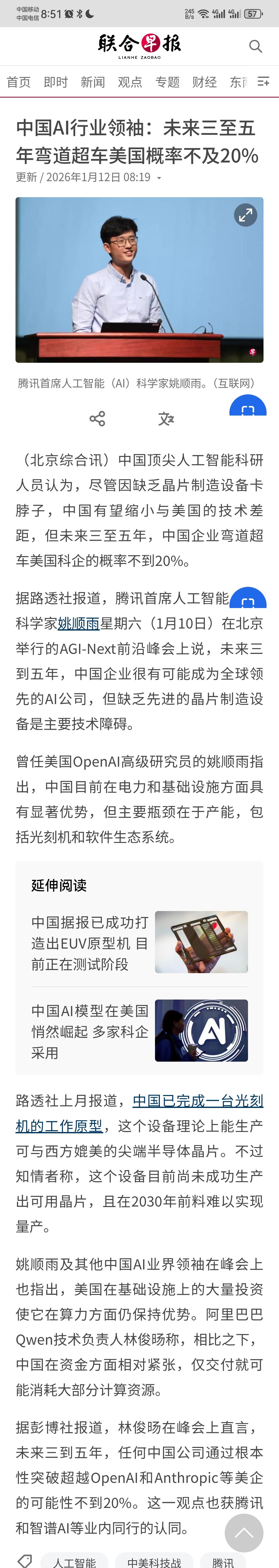 根据《联合早报》1月12日报道,中国AI行业领袖姚顺雨、林俊旸等人,最近在AGI-Next前沿峰会上,非常坦率而务实地做出了一个判断:“在未来三至五年,中国企业弯道超车美国科企的概率不到20%。”姚顺雨随后更是说出了自己之所以做出这个判断的理由。 他们说,现在中国AI行业毫无疑问已经发展得非常繁荣,涌现出了大量优秀的初创企业,几大科技巨头所取得的成果也非常丰硕,而且中国AI行业也具有一个极大的优势,那就是在电力和基础设施方面,领先其他所有国家,而这是AI行业发展的一个根基,我们的基础是无比夯实的。 但是,随后姚顺雨等人就指出,也需要看到,我们现在仍旧存在几个瓶颈,其中最为主要的便是光刻机与软态生态系统,我们现在还没有最先进的光刻机,类似于英伟达制造出的那种软件生态系统,也并不成熟,这两个瓶颈可以说是极大限制了我们AI产业的发展。 毫无疑问,无论是光刻机,亦或者是高端人工智能芯片,以及先进的软件生态系统,我们的突破都只是一个时间问题,即便是眼下,我们也都已经取得了非常巨大的进步,但是从客观上来看,这方面我们仍旧与美国存在巨大的差距,而这也是限制我们AI产业发展的一个重要因素。 正因为有这样的短板存在,所以我们在未来3~5年的时间内,想要弯道超车美国科技企业,可能性是很小的,姚顺雨认为这个可能性不足20%。 不得不说,姚顺雨等人这个发言,相当务实而清醒,也非常坦率,他相当清醒地指出了我们现在所面临的客观困难,无论做什么事情,都很难一蹴而就,科技发展更是如此,必须要一步一个脚印慢慢来,总是渲染什么在短时间内就超级大发展,这并不是符合客观世界的现实法则。 这足以说明,我们的研究人员,总体上都是非常清醒务实的,并没有被眼下的一点成绩就冲昏头脑,与此同时他们更没有因此而沮丧气馁,他们虽然指出了我们的不足,但是也能够清醒认识到我们的长处,同时更着眼于长远,认为未来我们追赶乃至超越美国的科技企业,只是一个时间问题,只不过不会那么快而已。 这或许才是我们中国企业、中国科技人员,能够不断取得各种突破各种成就的一个根本原因,那就是在保持信心的同时也同时抱有冷静、理智的客观态度。相信未来AI行业,在这样一批优秀的企业家,优秀的科研人员、技术人才的带领之下,必定会爆发出前所未有的璀璨光彩。