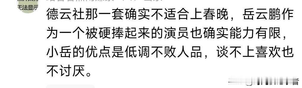 2014年到2025年,岳云鹏已经连续8次登上央视春晚舞台。 如今2026年宣布不参加了,他表示:“因为我能耐就这么些,写不出更好的东西。” 他的作品虽然大家一笑而过,但是五环,扇子上写词,烧鸡,都是经典之作。 有网友说,德云社那一套确实不适合上春晚,岳云鹏作为一个被硬捧起来的演员也确实能力有限,小岳的优点是低调不败人品,谈不上喜欢也不讨厌。 也有人说,岳云鹏给我们留下了很多笑声,这些笑声本身就是作品带来的。 其实岳云鹏也是一个励志的代表,没有家庭背景,没有学历,打工人遇到伯乐,运气爆发,勤学苦练,成了公众人物,如今能上春晚,能有自己的粉丝,能开演唱会,确实好像开挂人生。