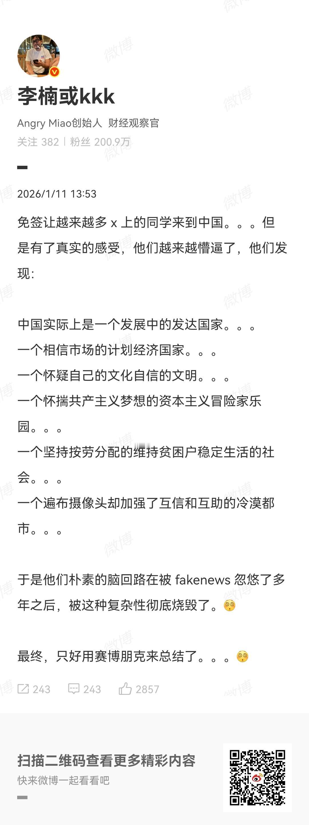 魅蓝前总裁李楠跟很多来中国旅游的外国人交流之后发现,这些因为免签政策来中国旅游的外国人,现在越来越懵逼,因为他们发现了一个跟欧美媒体报道的完全不一样的中国。 他们发现: 中国实际上是一个发展中的发达国家;一个相信市场的计划经济国家;一个怀疑自己的文化自信的文明;一个怀揣共产主义梦想的资本主义冒险家乐园;一个坚持按劳分配的维持贫困户稳定生活的生活;一个遍布摄像头却加强了互信和互助的冷漠都市。 在外国媒体的形容中,我们被打上了很多负面的标签,可是等到这些人真的亲身实地来看一一看之后,就发现这些标签全部都是虚假的,我们所创造的成就,我们所造就的社会,呈现出了一个远远比欧美社会更加合理、更加充满活力、更具有负责感的社会。 这些外国人被那些外国媒体打下了牢固的思想钢印,心中的固有观念一时间还难以改过来,但是他们亲眼所见到的事实又说明这一切都是错误的,于是脑子里面CPU都快要被烧坏了。