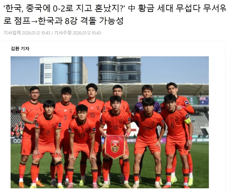 韩媒的文章标题为《“韩国队0-2输给这支中国队,吓坏了吗?”中国的黄金一代确实很可怕……他们1-0击败澳大利亚,跃居第一,可能在1/4决赛遭遇韩国队》。