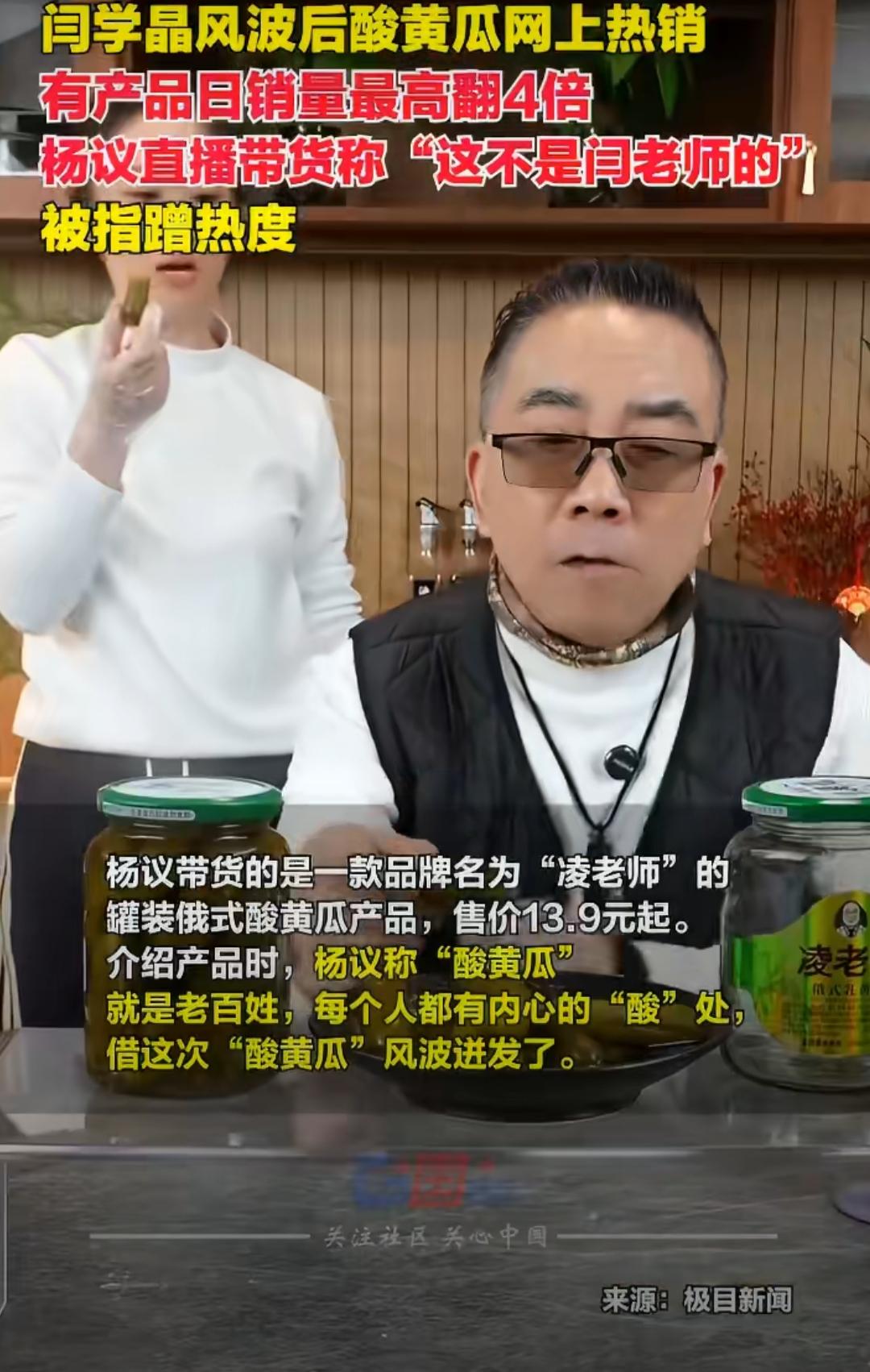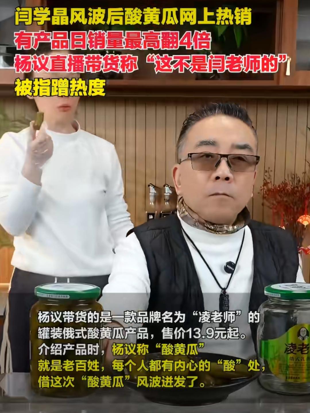 酸黄瓜销量翻倍!闫学晶的瓜,商家的狂欢 谁能想到,闫学晶的哭穷风波,竟让酸黄瓜成了最大赢家! 相关产品日销量直接翻4倍,网友们一边吐槽明星脱离大众,一边反手下单“接地气”的酸黄瓜。 更搞笑的是,演员杨议直播带货时,还特意强调“这不是闫老师的”,生怕沾上边,却被吐槽是反向蹭热度。 这边闫学晶刚发文道歉“忘了本”,那边酸黄瓜已经卖断货,这波反转,属实离谱又好笑!