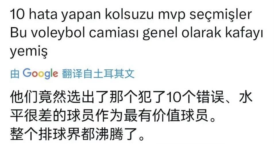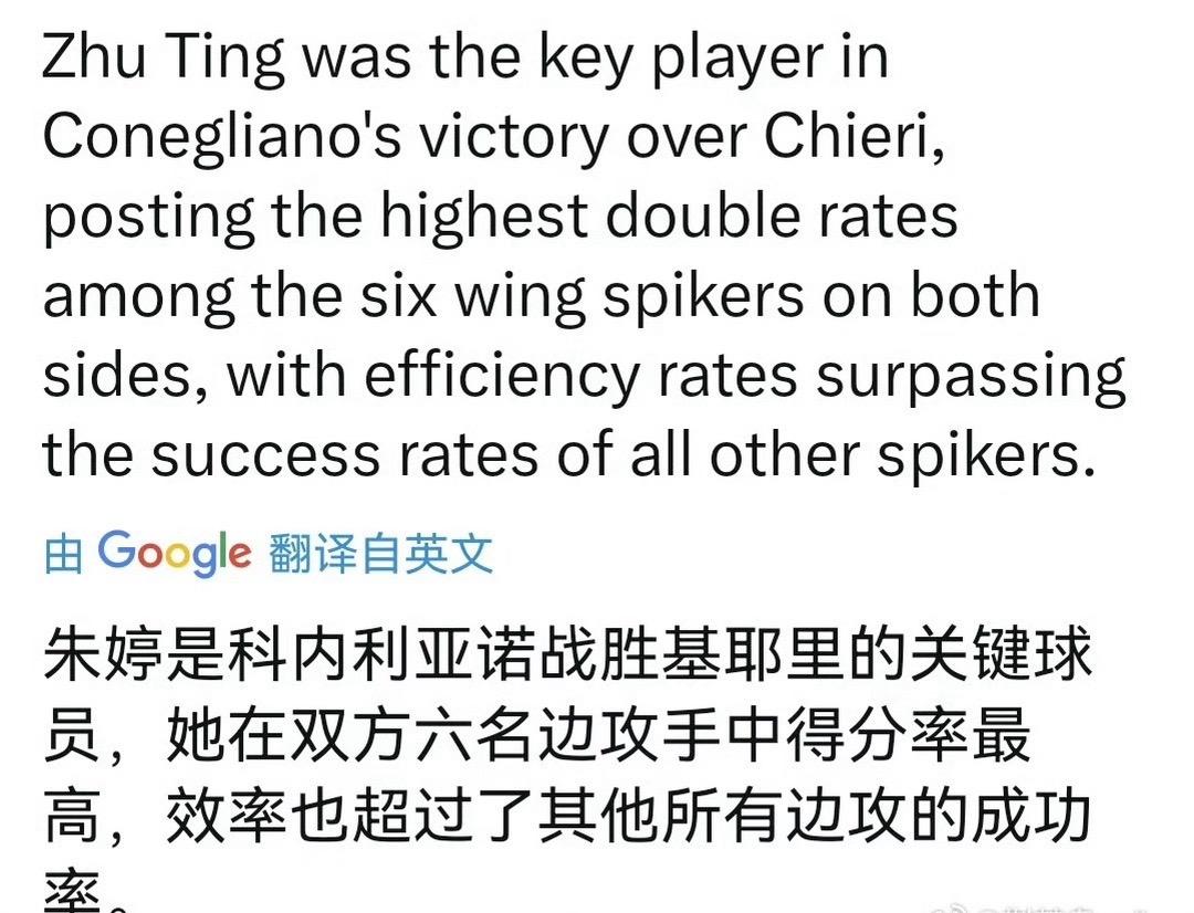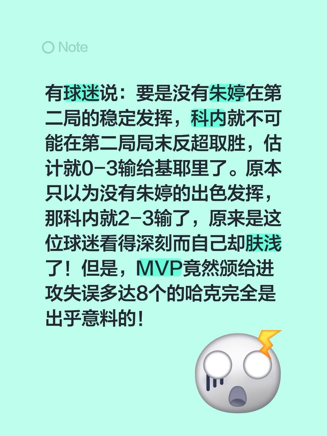 有球迷说:要是没有朱婷在第二局的稳定发挥,科内就不可能在第二局局末反超取胜,估计就0-3输给基耶里了。原本只以为没有朱婷的出色发挥,那科内就2-3输了,原来是这位球迷看得深刻而自己却肤浅了!但是,MVP竟然颁给进攻失误多达8个的哈克完全是出乎意料的!