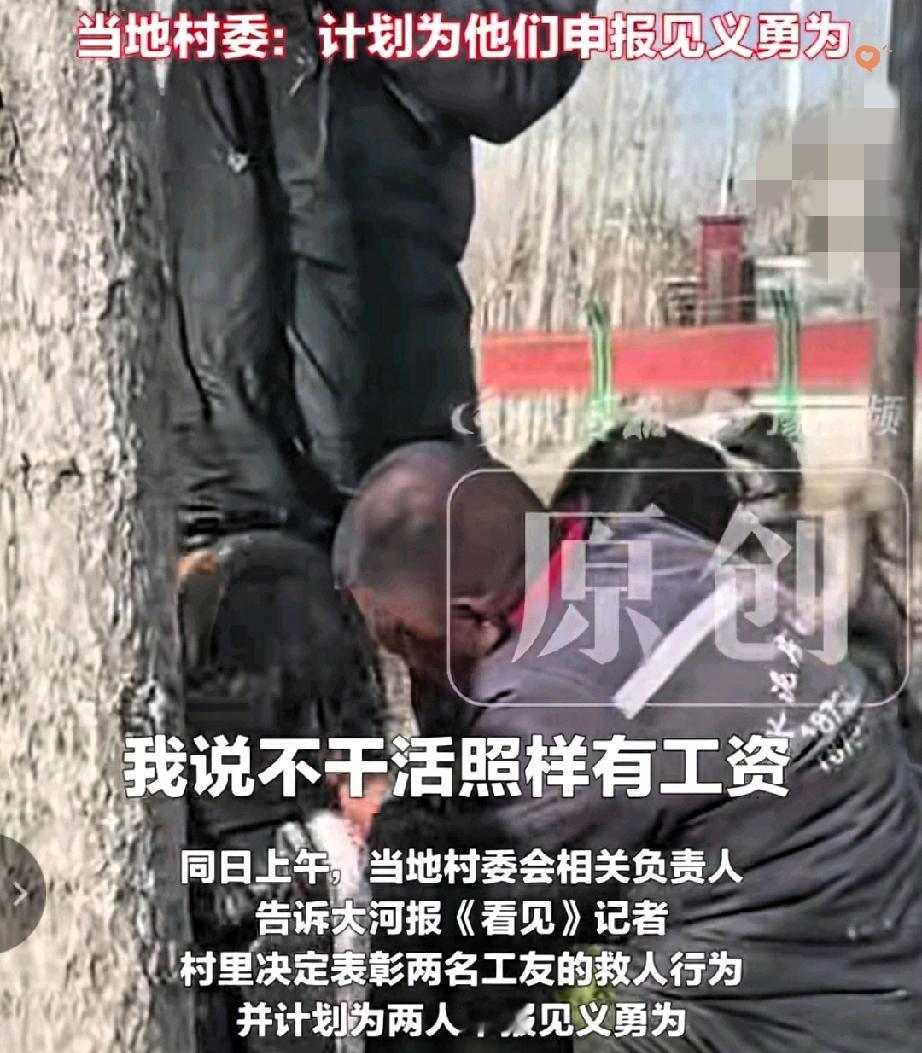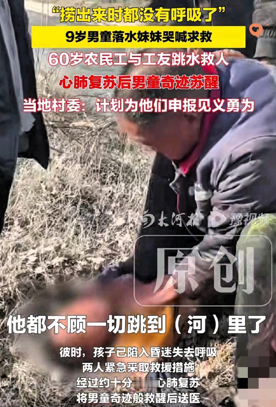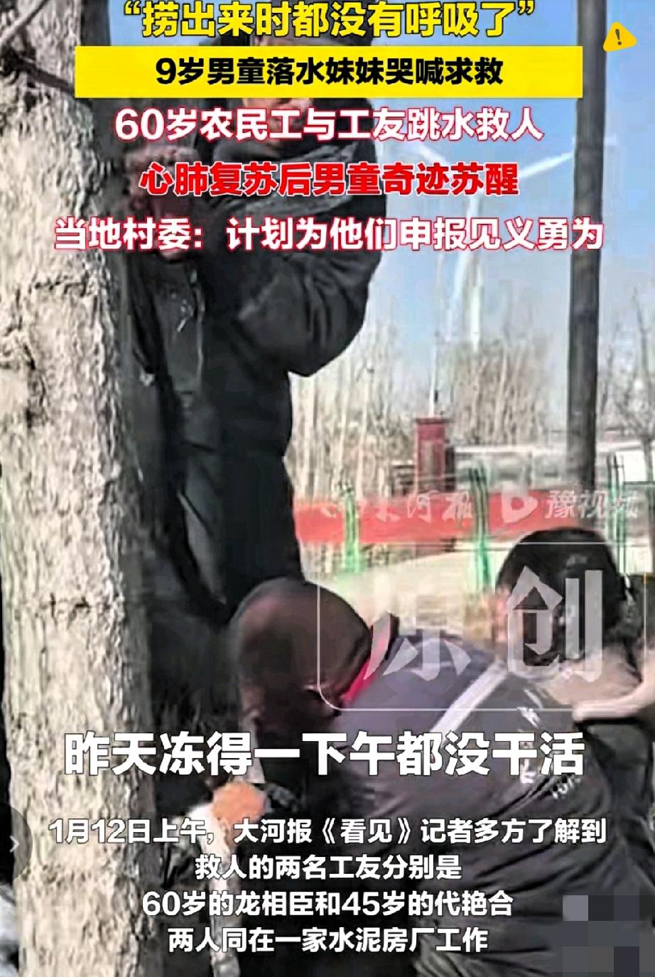 60岁的农民工大爷,用一次寒冬里的跳水,给所有人上了堂最动人的课! 河南兰考,9岁男童落水没了呼吸,妹妹哭着求救时,龙相臣和代艳合二话不说跳进冰冷的河里,摸了五六分钟才把孩子救上岸,又拼了命做心肺复苏,硬是把孩子从鬼门关拉了回来。 龙大爷冻得一下午没法干活,手机也泡坏了,可他从没提过一句后悔。 更暖的是,厂里老板说不干活也给工资,还要给他买新手机,村委也忙着帮他们申报见义勇为。 这世上从没有从天而降的英雄,只有挺身而出的普通人。 他们干着最朴实的活,却揣着最滚烫的心,用本能的善良,撑起了人间的温度。 你身边有没有这样默默发光的普通人?他们的哪个举动曾让你觉得特别温暖?
