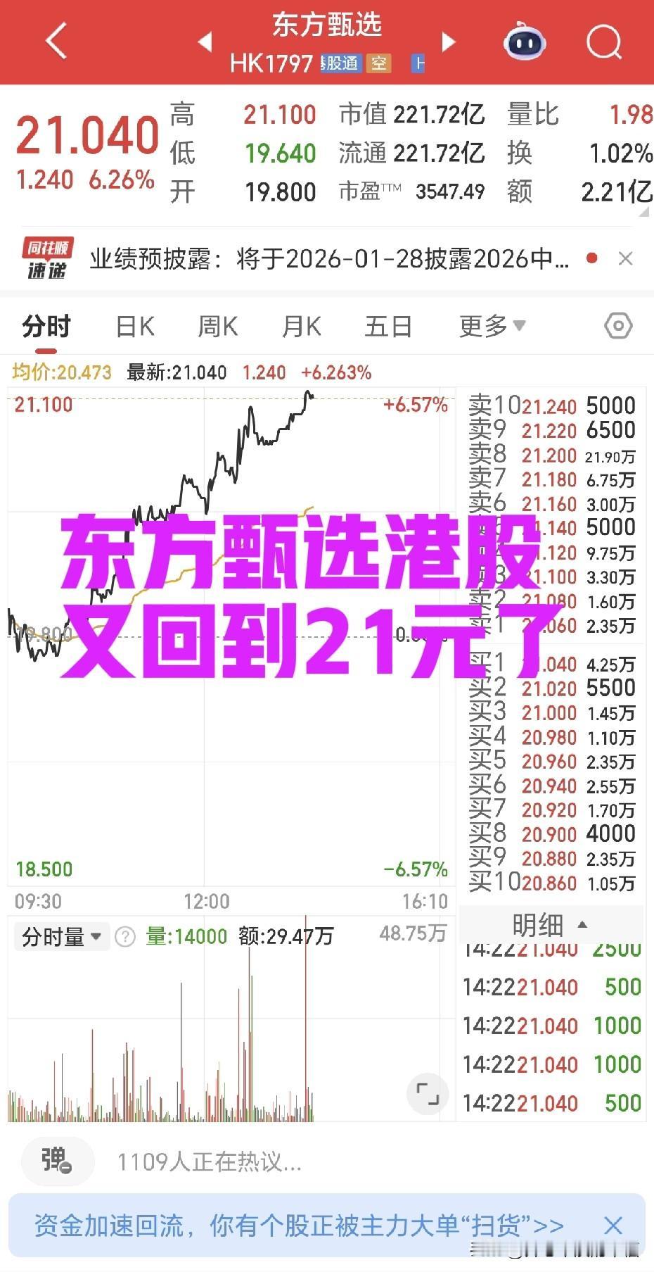 高兴啊!大盘涨疯了,4100多点了,今天涨了40多个点,虽然我的股没涨,但是看到东方甄选今天又破21了,我打心眼里高兴!这两天俞老师和欣然在东方甄选看世界,太辛苦了,昨晚10点多,俞老师还在播,今早看到又在播,60多岁了,真的很辛苦。 俞老师差钱吗?俞老师差钱,俞老师需要钱不是为了自己,是为了身后几十万员工,是为了很多没有钱上学的孩子,还有灾难时俞老师需要钱帮助陷入困境的同胞……