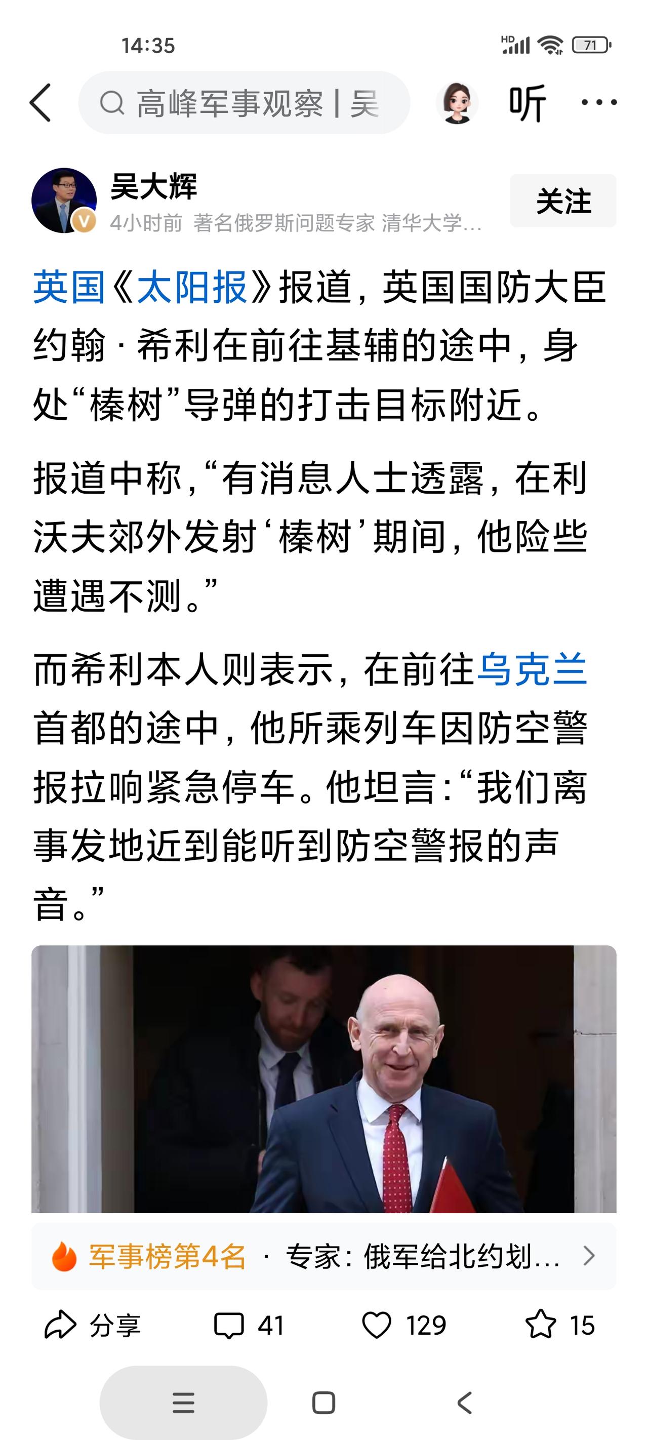 怪不得泽连斯基急眼了,非得要求安理会召开紧急会议。 原来在俄罗斯的报复行动中,“榛树”导弹险些把访乌的英国国防大臣送走。当时,英国代表团一行人所乘的列车,正好在导弹打击的目标附近。 众所周知,再精准的导弹也是有误差的,还好,俄罗斯用的是误差较小的“榛树”导弹。 “赞助商”差点儿被送走,不表示表示说不过去。