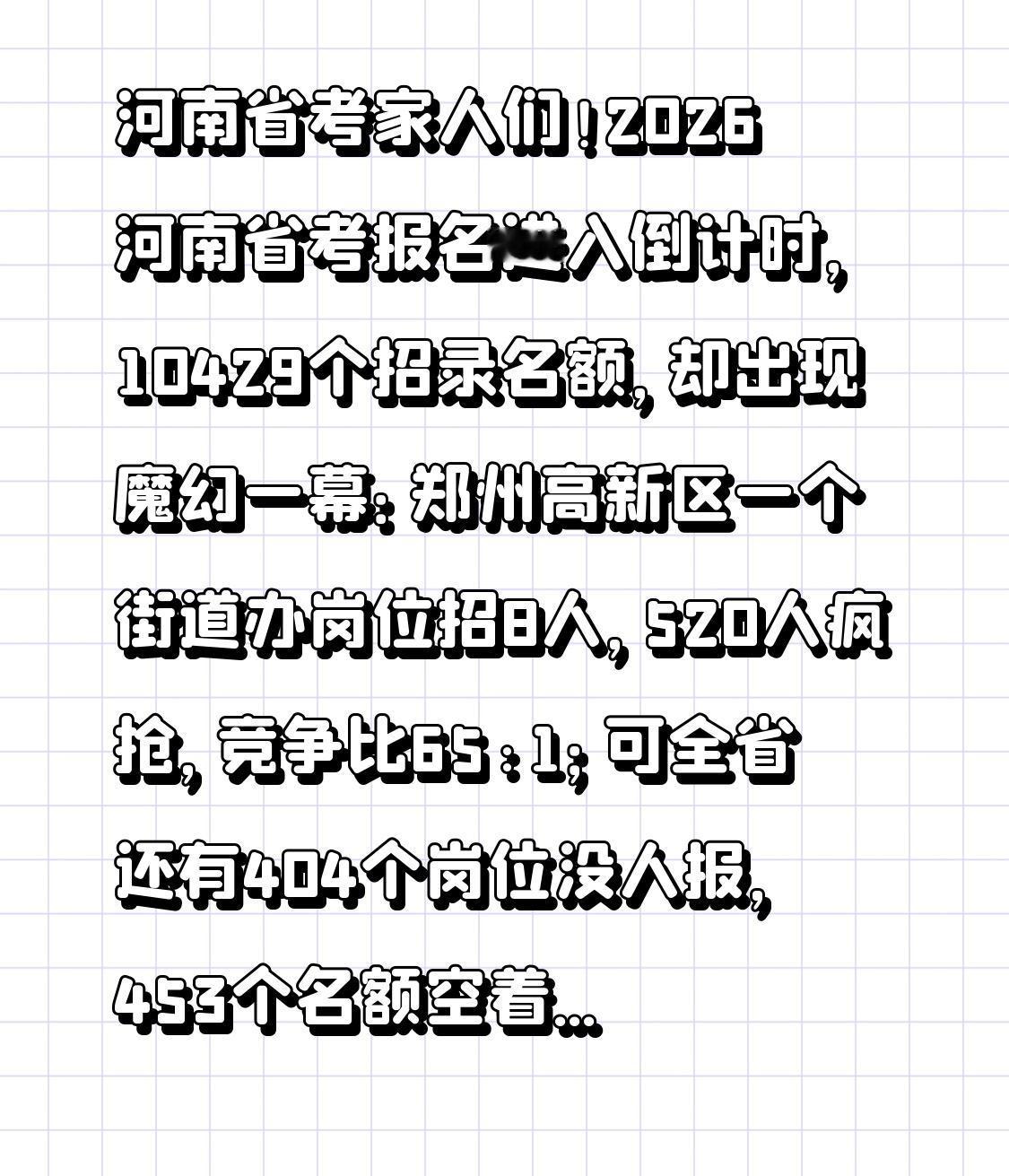 河南省考 家人们!2026河南省考报名进入倒计时,10429个招录名额,却出现魔幻一幕:郑州高新区一个街道办岗位招8人,520人疯抢,竞争比65:1;可全省还有404个岗位没人报,453个名额空着没人要!一边是千军万马挤独木桥,一边是机会摆在眼前没人捡,今天这条视频扒透省考报考真相,帮你避开炮灰坑,找准上岸捷径! 先说说热门岗有多卷!省发改委、郑州市财政局这些省直和热门城市岗位,清一色几十人抢一个名额,郑州石佛街道办更是创下520人争8岗的纪录。很多人抱着“冲编制就选大城市”的想法盲目跟风,却不知道这些岗位不仅竞争激烈,后续审查还暗藏玄机:资格初审只查形式不查真实性,去年有考生因为没提前准备辅修专业成绩单,面试直接被刷,备考大半年全白费! 重点转折来了!那些无人问津的冷门岗,真不是没前途,而是大家没摸清报考规则!其实今年省考藏着超多政策红利:第一,辅修、第二学位也能报考,只要能提供成绩单和证书,新乡等地甚至不限制主修专业 ;第二,年龄放宽到43岁,2026应届硕博不用再被38岁门槛卡住;第三,法律职业资格证没下来也能报,9月30日前拿到证书就行 ;第四,技工院校毕业生可参照大专、本科报考,学历门槛大幅降低。 这些冷门岗大多集中在市场监管、法检助理等领域,看似要求高,实则是“隐形福利岗”。比如法院法官助理岗,虽然需要司法考试证书,但一旦上岸,职业发展前景远超普通基层岗;还有部分乡镇基层岗,不限制专业,却因为“地理位置偏远”被忽视,实则竞争比低到1:3,报了基本半只脚上岸。 报考时这3个坑千万别踩:第一,别只盯热门城市,洛阳、新乡等地的市直岗位竞争小,待遇却不差;第二,专业不符别直接放弃,参照2023版本科专业目录,相近专业可凭课程成绩单审核通过 ;第三,别信第三方培训机构,官方明确不指定辅导用书,避免花冤枉钱还被骗。 再给备考的家人们提个醒,3月14日笔试,现在复习还来得及!行测重点抓政治理论模块,今年题量分值都提升了,还要关注黄河流域生态保护等河南本土热点;申论县级卷侧重实务写作,多积累“五星”支部创建等基层治理案例。记住,省考不是拼运气,而是拼信息差,选对岗位比死磕分数更重要。 最后想对所有考生说,备考路上的孤独和坚持,只有自己知道。每天刷题到深夜,背时政背到嗓子哑,一次次拒绝朋友聚会,只为一个稳定的未来。别让盲目跟风浪费你的努力,也别让信息差错过上岸机会。愿每个挑灯夜读的你,都能选对岗位、超常发挥,在今年的省考中得偿所愿,成功上岸!觉得有用的赶紧收藏转发,评论区聊聊你准备冲哪个岗位~