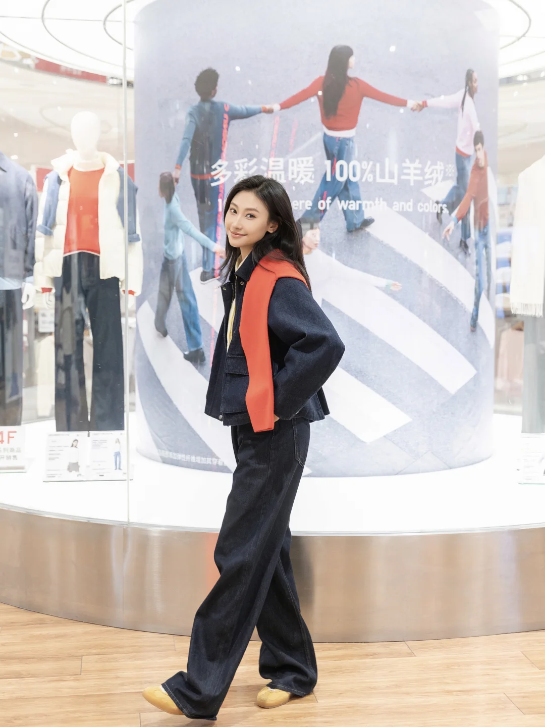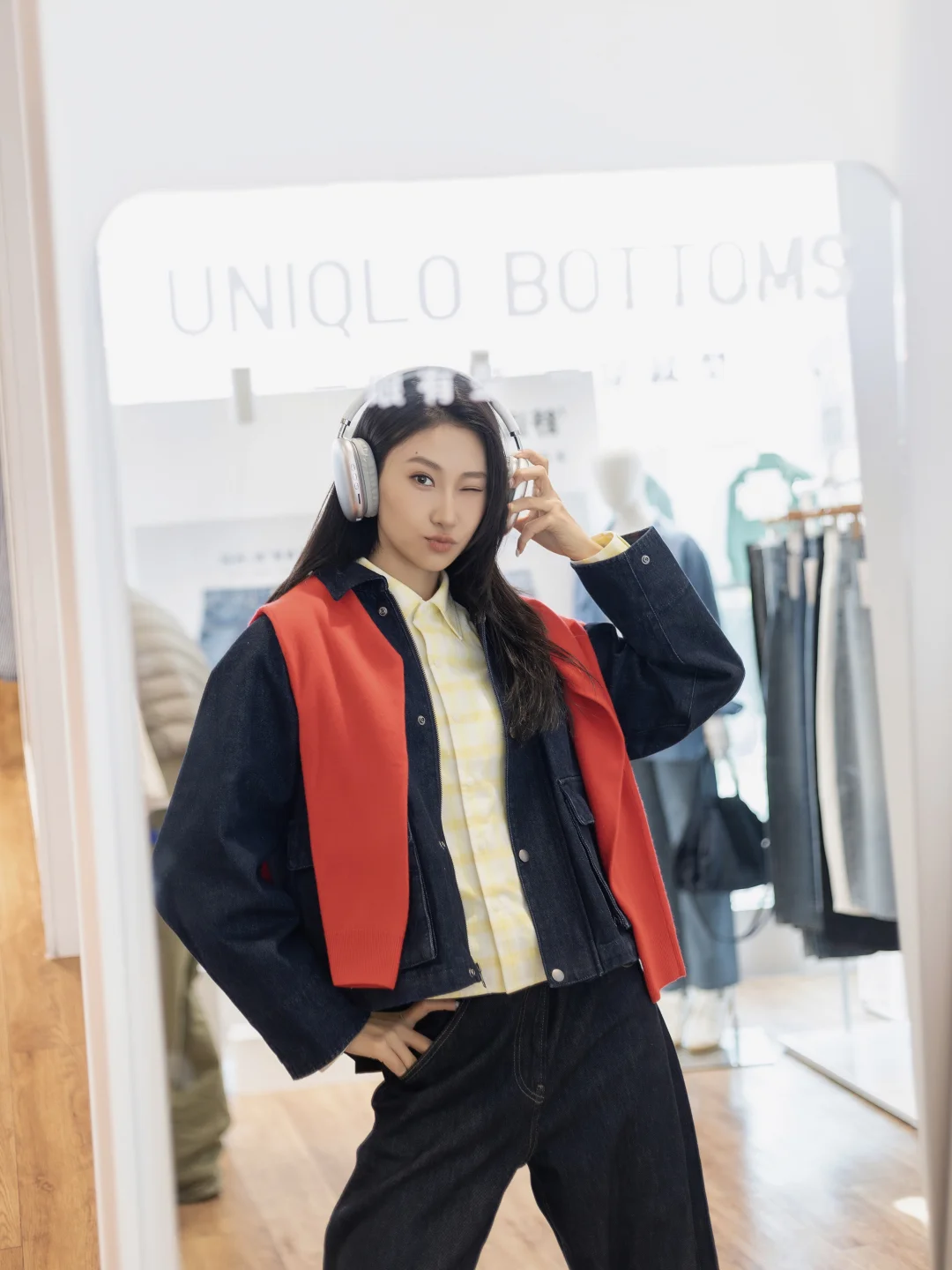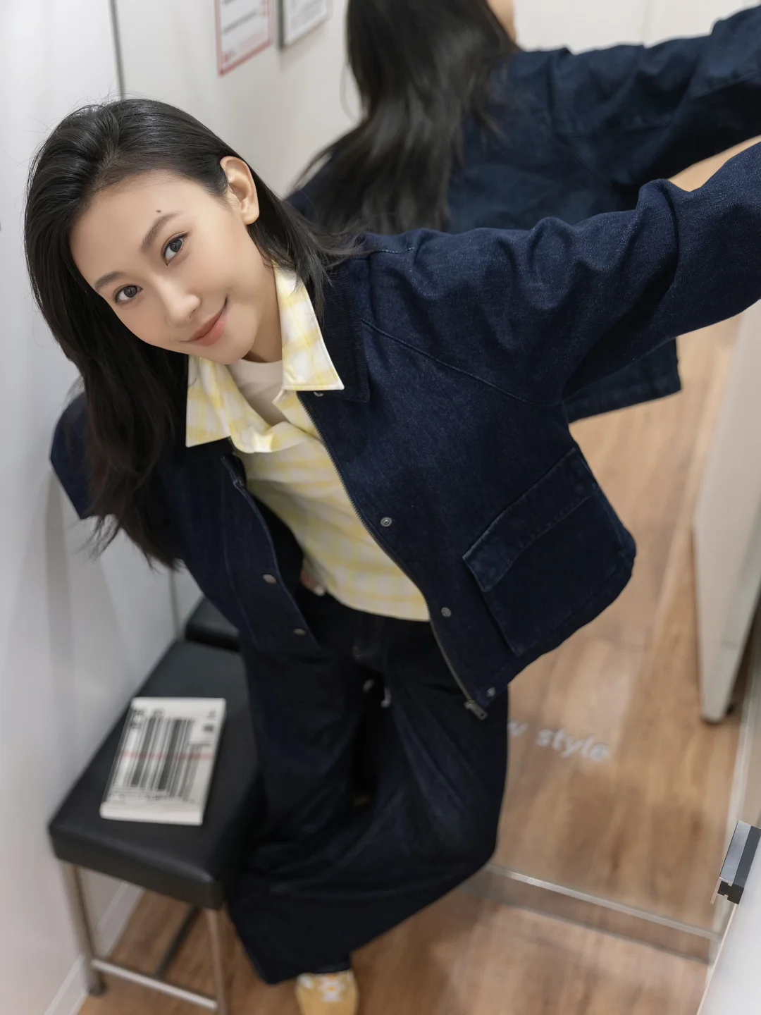 我选的是深色丹宁短款夹克,搭配同色系的高腰加长阔腿牛仔裤。牛仔面料偏软,穿起来不会有传统牛仔那种硬挺感,活动起来比较轻松。
