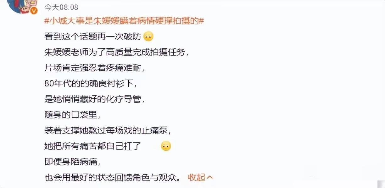 朱媛媛在生命尽头强忍病痛拍完《小城大事》,杀青16天后离世。她生前偏爱去寺庙,为丈夫辛柏青和女儿留下精神寄托;她塑造的鲜活角色高雪梅,也成为激励家人积极生活的伏笔。 网友评论: 电视广告代言里看不见她,代表委员座席里看不见她,综艺打闹群里看不见她,花边野闻里看不见她。要见她,只有在影视剧里。她,就是朱媛媛。她是真正的艺术家,将永远活在观众心中! 在这物欲横流的时代,有这样难得的为了艺术拼命的艺术家,让人敬佩也颇有些惋惜一路走好 朱媛媛,是内心强大的人,一般人精神上早垮了,她到生命的最后,给大众呈现的也是微笑,永存的性格的魅力,叫人佩服。 不敢想,辛柏青看朱媛媛新剧时,得有多难过