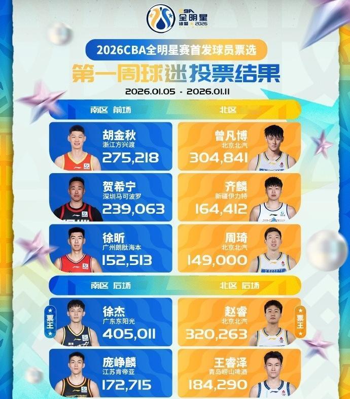 26年CBA全明星首轮投票结果出炉! 其中南区票王是徐杰,领先后场第二名新秀庞峥麟2.3万多票;前场方面胡金秋、贺希宁位居前二,老将周鹏则排在第六位。值得一提的是郭艾伦票数仅位列第四。 北区票王赵睿以320263票成为后场榜首,前场则是曾凡博以304841票领跑,周琦、沈梓捷紧随其后,阿不都沙拉木排在第五位。