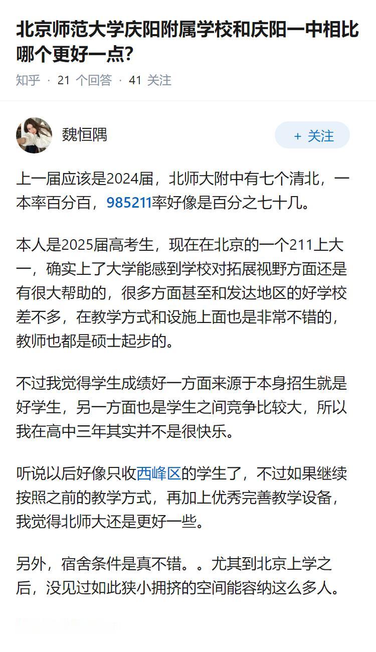 北京师范大学庆阳附属学校和庆阳一中相比哪个更好一点?