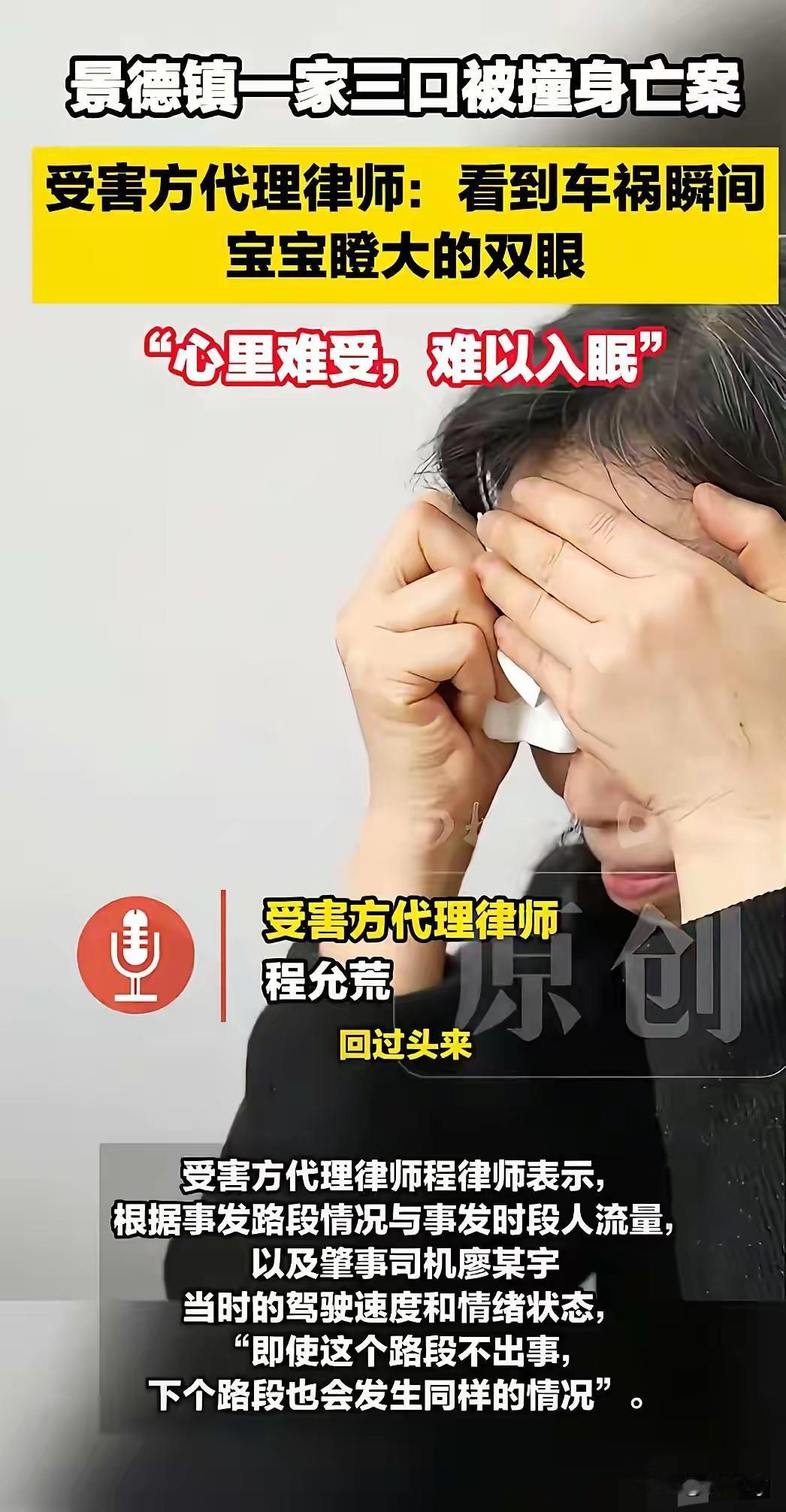 景德镇一家三口车祸案,胡妈妈的代理律师程允荒说在法庭上,通过大屏幕观看完证据视频后心情久久不能平静! 程律师说大屏幕显示那个11个月大的宝宝在被撞的一瞬间,回过头瞪着大眼睛看着这辆车,瞬间就被夺去了生命! 宝宝好像感觉到危险了,清澈的瞳孔里倒映着飞速逼近的死亡! 宝宝那种无知又懵懂的眼神对程律师的震撼太大了,他说晚上睡觉的时候时不时的画面就会浮现在眼前,很久不能入眠! 就因为讨论了一件虚无缥缈的玩笑而已,竟然要了一家三口人的性命!作为旁观者都痛心不已,父母怎么能释怀!