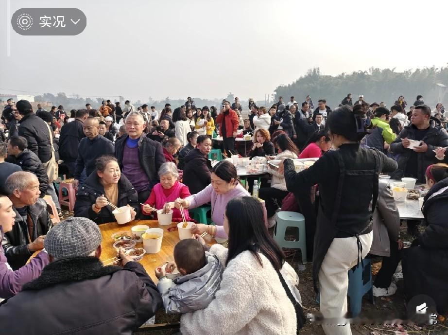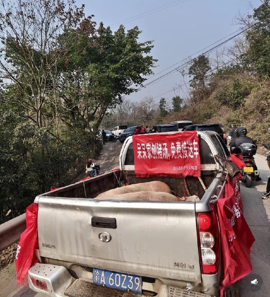合川呆呆家杀年猪火成“乡村嘉年华”! 数万人挤爆现场太震撼 重庆合川的乡村公路上,摩托队排成长龙蜿蜒数里,皮卡车挂着“呆呆家刨猪汤免费接送车”的红幅穿梭其中,这不是景区旺季,只是呆呆家一场杀年猪的民俗活动。我中午揣着期待赶到,先在太平嗦了碗喷香的钟鼓楼羊肉粉,到现场直接被人山人海惊到——后厨里网友们撸起袖子帮忙择菜、端碗,院坝里摆开的长桌坐满了食客,鸭肉、猪肉、鱼肉轮番端上桌,热乎的刨猪汤香飘老远。 工作人员正忙着搭灯光、布舞台,听说晚上还有直播达人的表演,连通信保障车都开到了现场。合川文旅的贴心安排,让这场乡土味的活动变得井井有条。 可这样的网红民俗活动,到底是让乡土文化活了起来,还是只是网红经济下的一场短暂热闹?有人觉得烟火气十足,也有人担心变了味,你怎么看?
