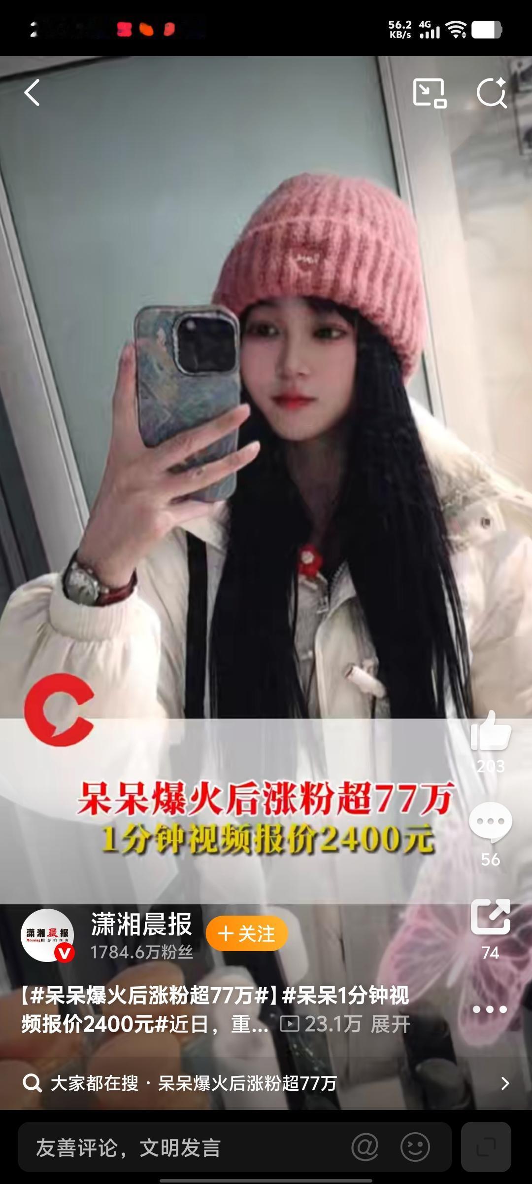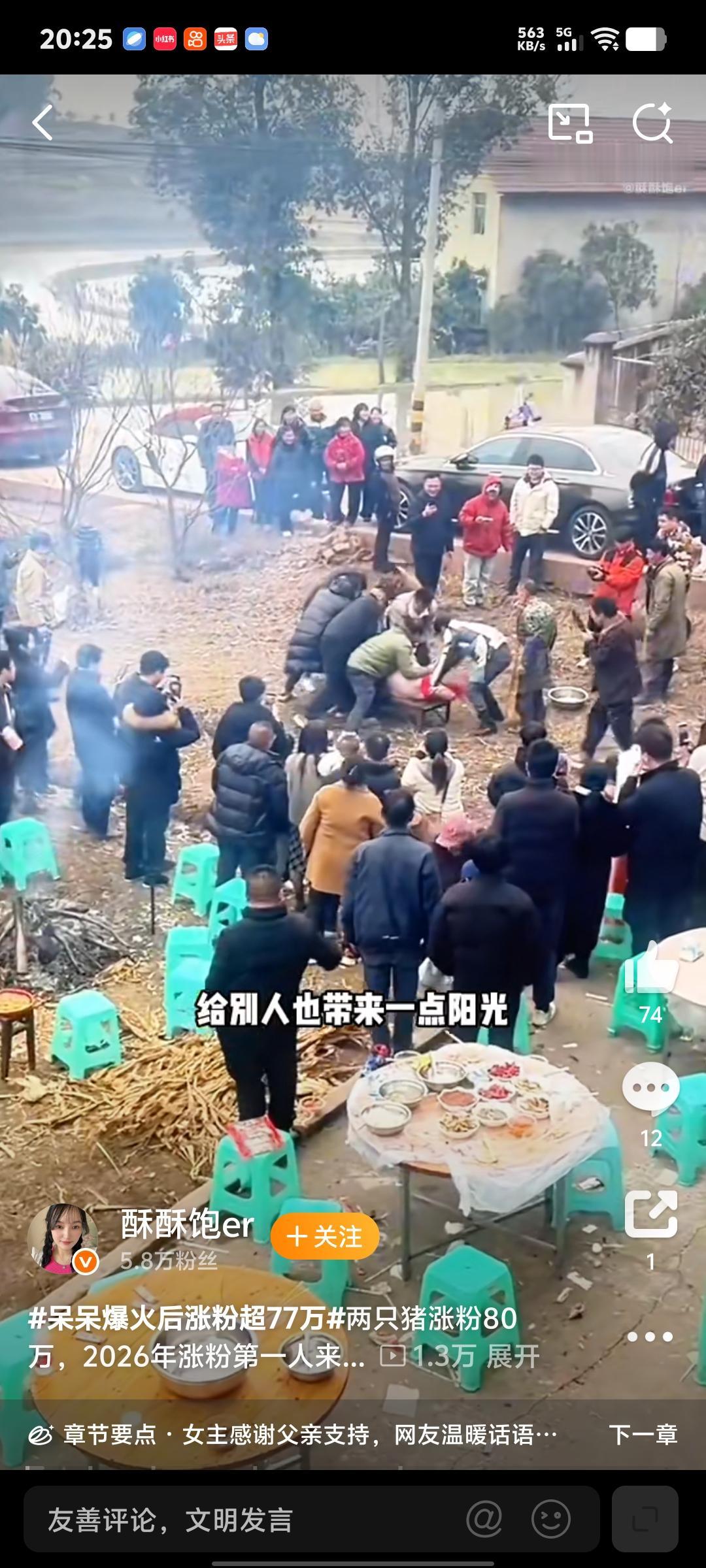 呆呆的账号视频变现了。1分钟2400元。21秒至60秒,1100元。1~20秒870元。账号粉丝达到77万多。 呆呆的爆红,他自己到现在都是有些懵的。女孩子的初衷很简单。因为家里没有男劳动力。 想杀年猪,怕老父亲按不住。所以邀请网友来。本来带些玩笑的视频却得到了上万网友的回应。 当然,呆呆的火也离不开当地文旅的推动。当地的文旅还有帽子叔叔以及各部门。 都成为强大的后盾。而且吃完猪肉之后,还有很多网友自发的送来肥猪,厨师各种菜。 当然也有一些争议,因为很多人来到现场直播。昨晚的呆呆哭了。来的人多,卫生造的很乱。 妈妈很辛苦,呆呆哭诉,没有人帮忙。一呼百应,今天来的网友都自发的干活。 2026年的第一波破天流量来了。这也是当地合川文旅的聪明之处,没用打广告,借着这波流量。直接就火起来了。 小姑娘不忘初心的回应,他暂时不会直播带货,最终目的就是为了宣传自己的家乡。 为女孩点赞。