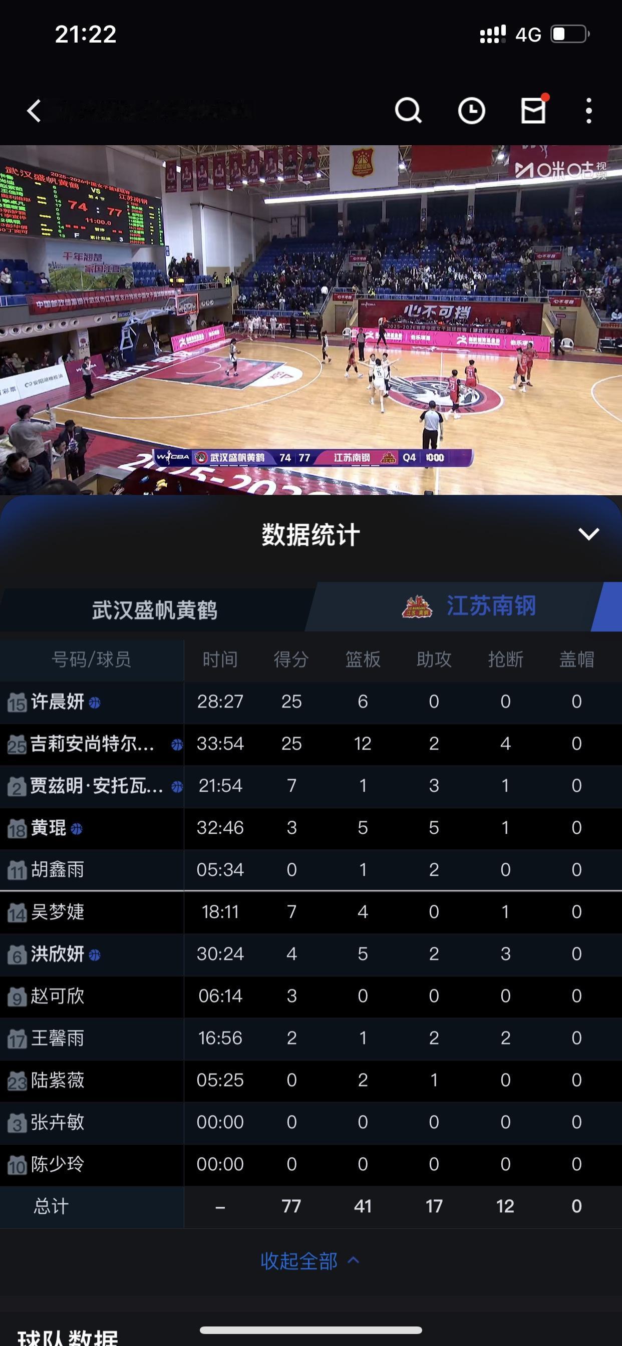 江苏女篮客场艰难地战胜武汉女篮77:74 刚刚我看完江苏女篮与武汉女篮的下半场比赛,快要结束时我开小差,去看了一眼山东女篮打破东莞女篮不败金身的那场比赛😂 江苏女篮真的赢的很艰难,全靠许晨妍25分6板和25号外援的25分12板2助攻才险胜对方 下半场回来虽然追平且反超了一点点比分,但是失误依旧不断,加上其她球员得分不在状态,始终无法拉开比分,之所以能赢球,还是因为武汉女篮的问题更多更致命 武汉女篮多次不敢投篮,多个球员在关键时刻不敢承担责任,失误也多,加上在第四节后半段打进关键5分的队长王佳琦伤退,让武汉女篮雪上加霜,彻底陷入困境,最后2分钟就得了2分,所以只能看着江苏女篮夺取胜利!