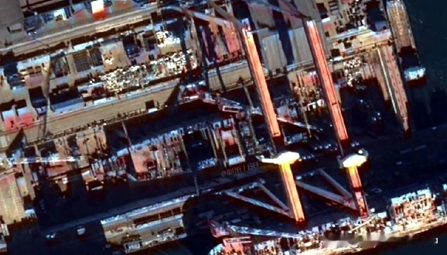 达利安船厂最新鸟瞰图 舰艏除球鼻艏外已基本成型,艉部分段虽入坞但尚未完全安装到位,机库侧壁分段向后延伸,底板铺设工作也已得到确认。 从当前施工节奏来看,水线以下舰体大部分分段有望在春节前实现合拢,年底前完成甲板吊装的可能性极大,乐观情况2027年上半年就能迎来下水时刻。 应该不会有18姊妹舰了,姊妹舰开工的时机已经过去了,现在这个阶段不如重新设计新的CV船体,采用新的动力总成,因为反正都无法保证能在关键节点FOC了。