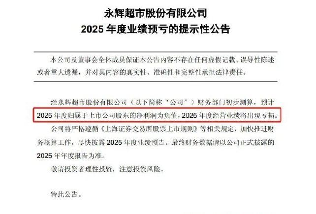 永辉超市公告称,公司财务部门初步测算,预计2025年度归属于上市公司股东的净利润为负值,2025年度经营业绩将出现亏损。