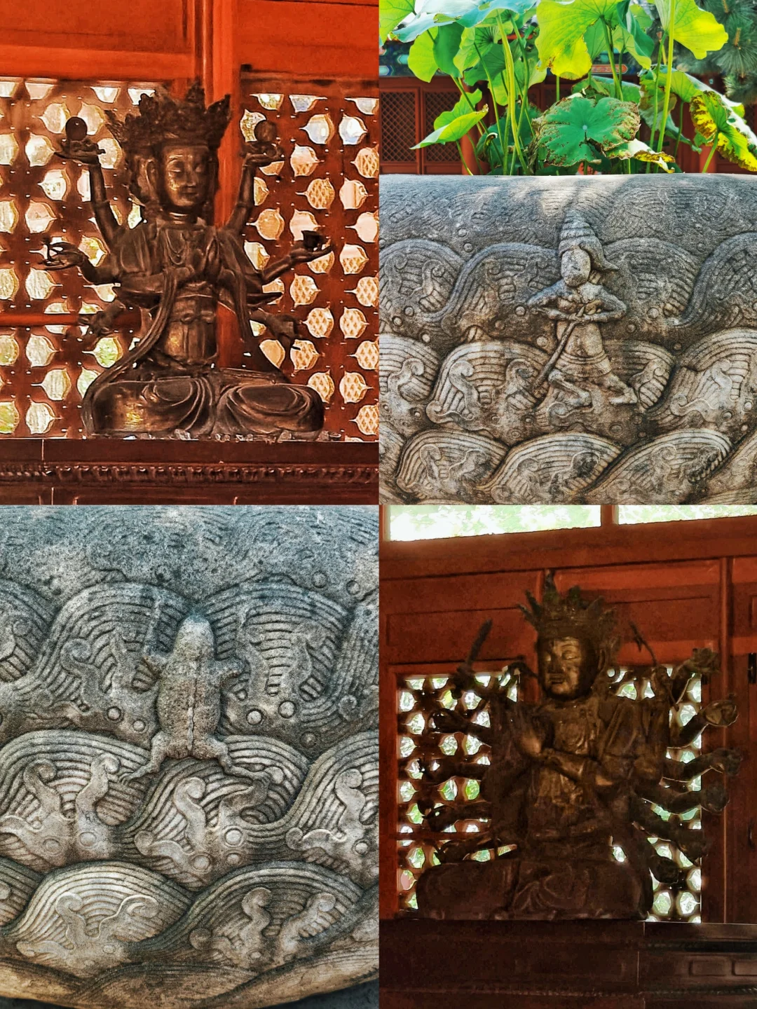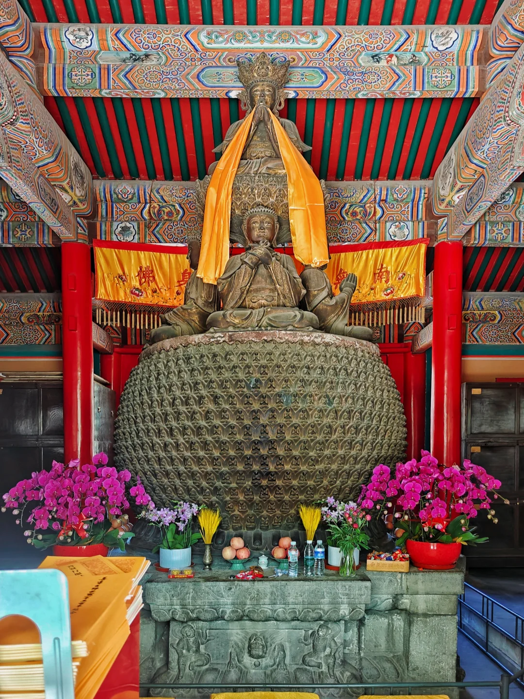 ·毗卢殿:元渎山大玉海(忽必烈下令造的原物是墨玉的,原是酒缸,明代流落到真武庙里腌过咸菜,目前在北海公园团城,这里底座还是原物,上面的缸是乾隆搞的替代品。这围栏加得也是没谁了),明铜质五方佛像(隆长寺。较少见形制,与河北正定隆兴寺的相比稍逊一筹)