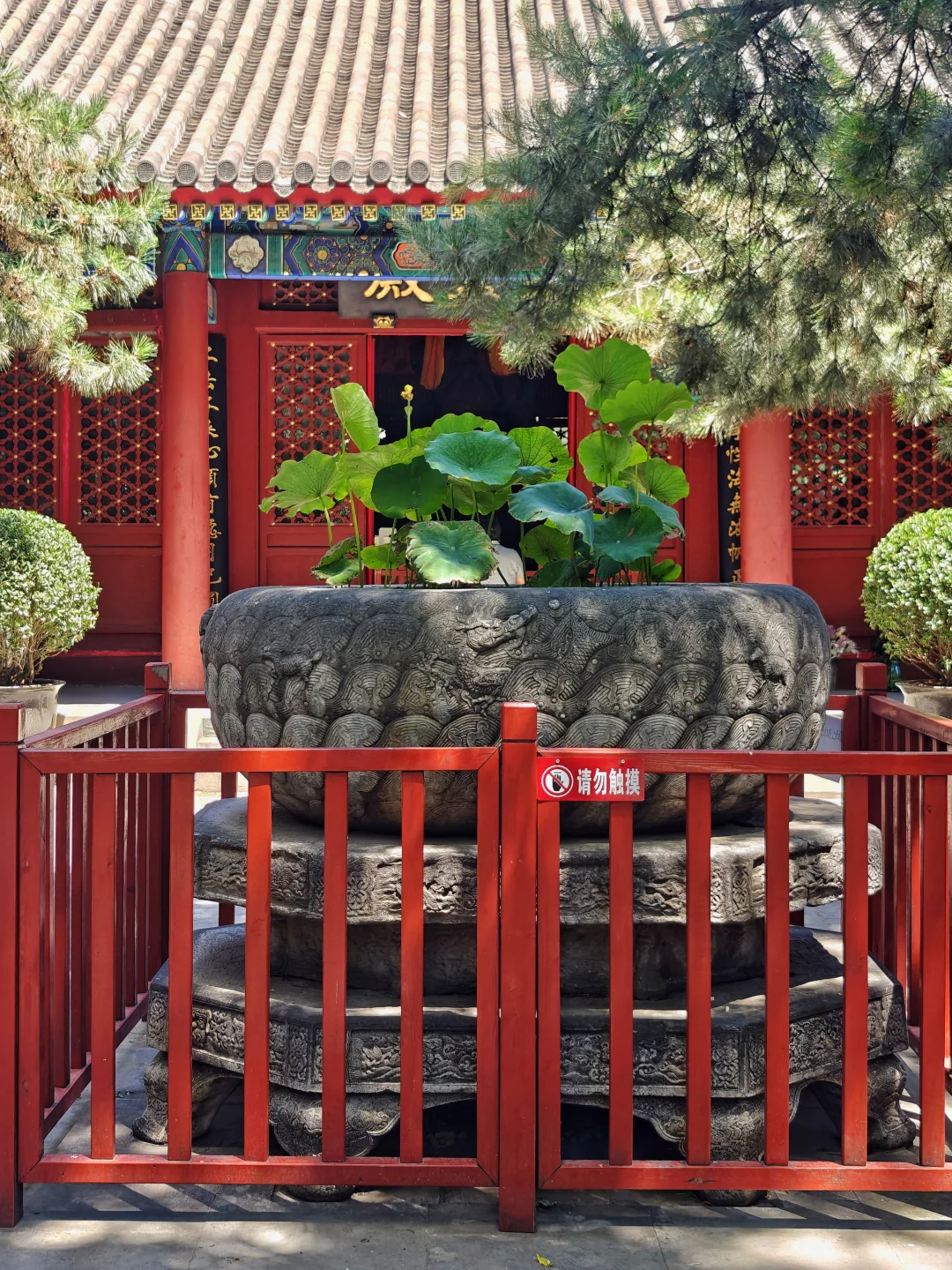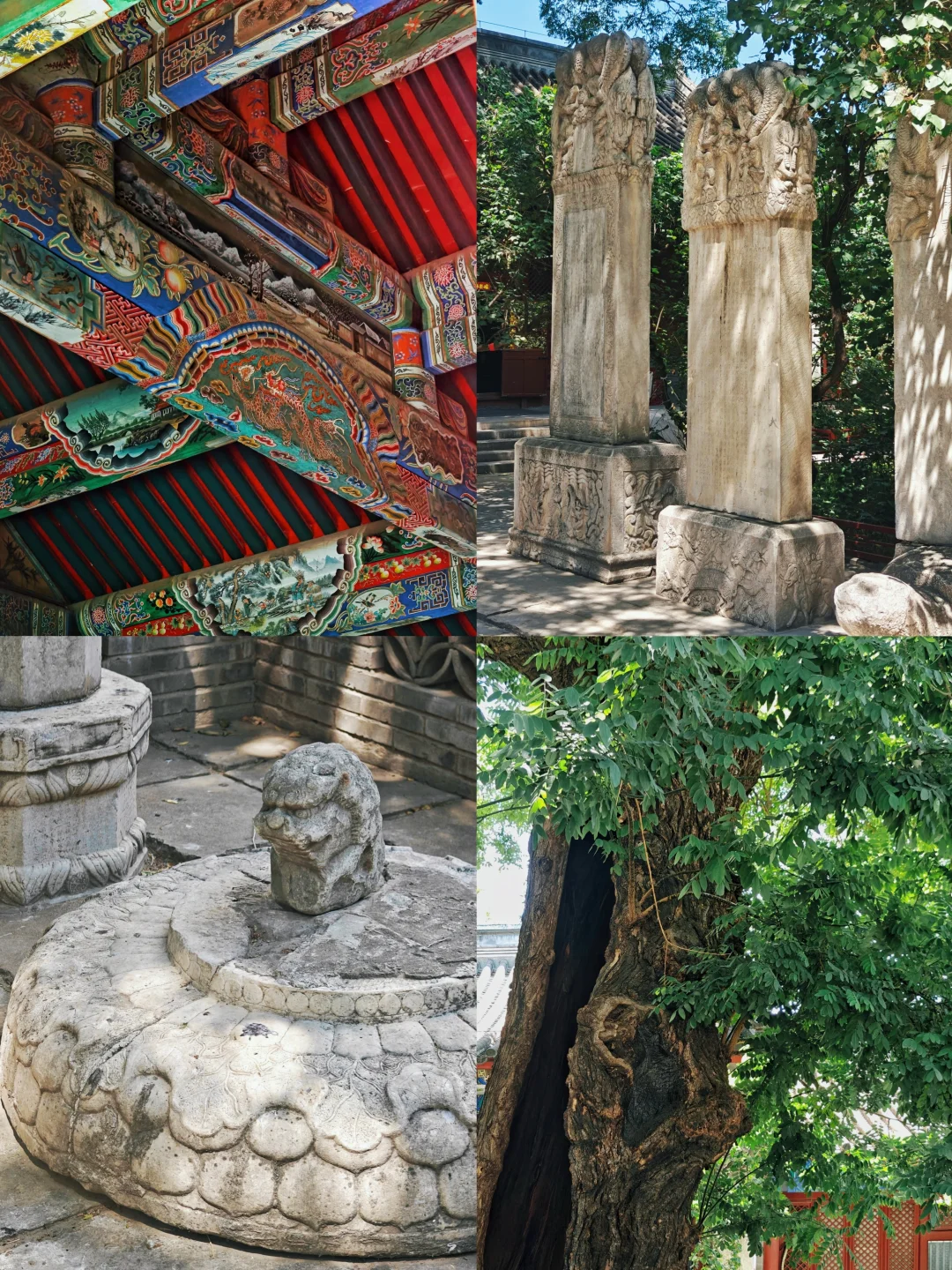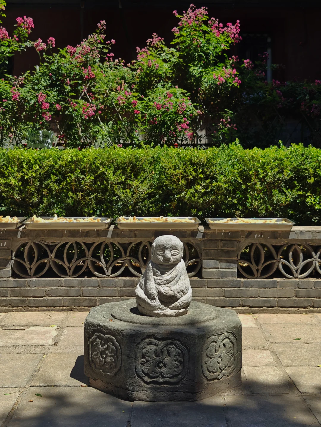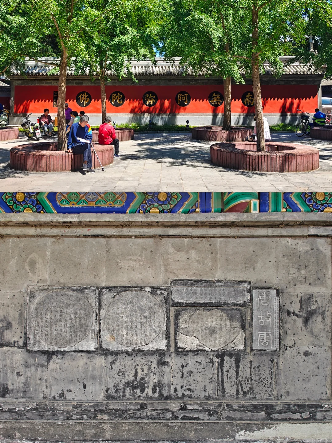 工作日去人很少(过了丁香花期),一半是当地居民,台阶上、大殿前、回廊中,大多手捧佛经念念有词。山墙前的广场上立有一个唐悯忠寺故址石灯,坐满了老人,充满生活气息。