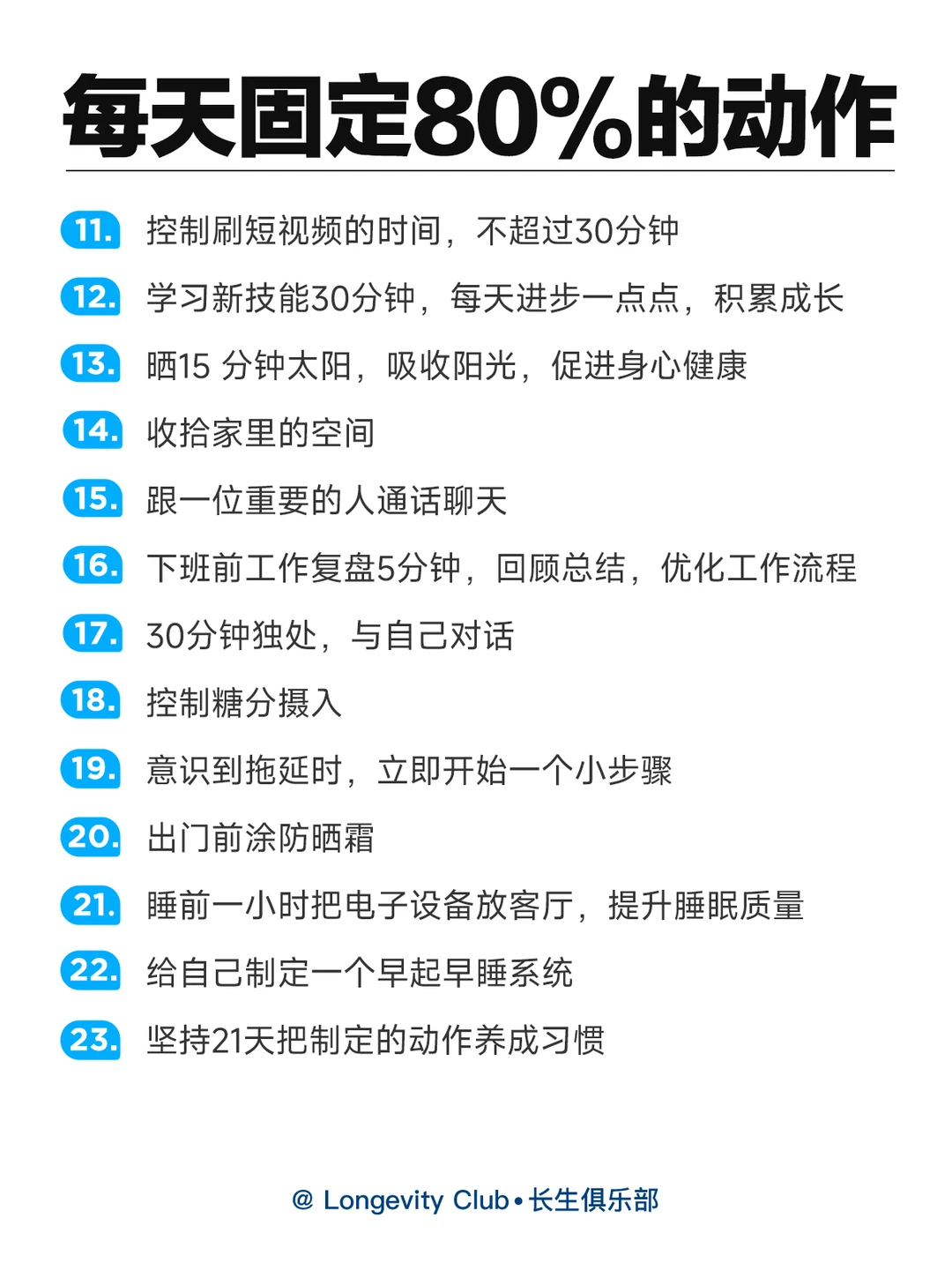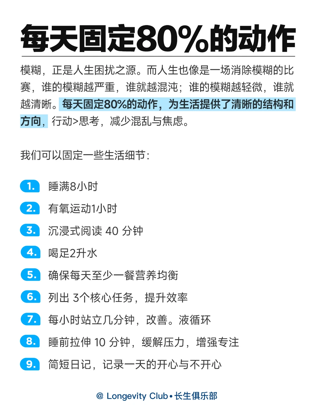 行动>思考 当我们每天固定80%的动作 生活中有一套可依赖的规律行为时 就会感受到自己 对时间、目标以及身心健康的把握更加坚定和稳定