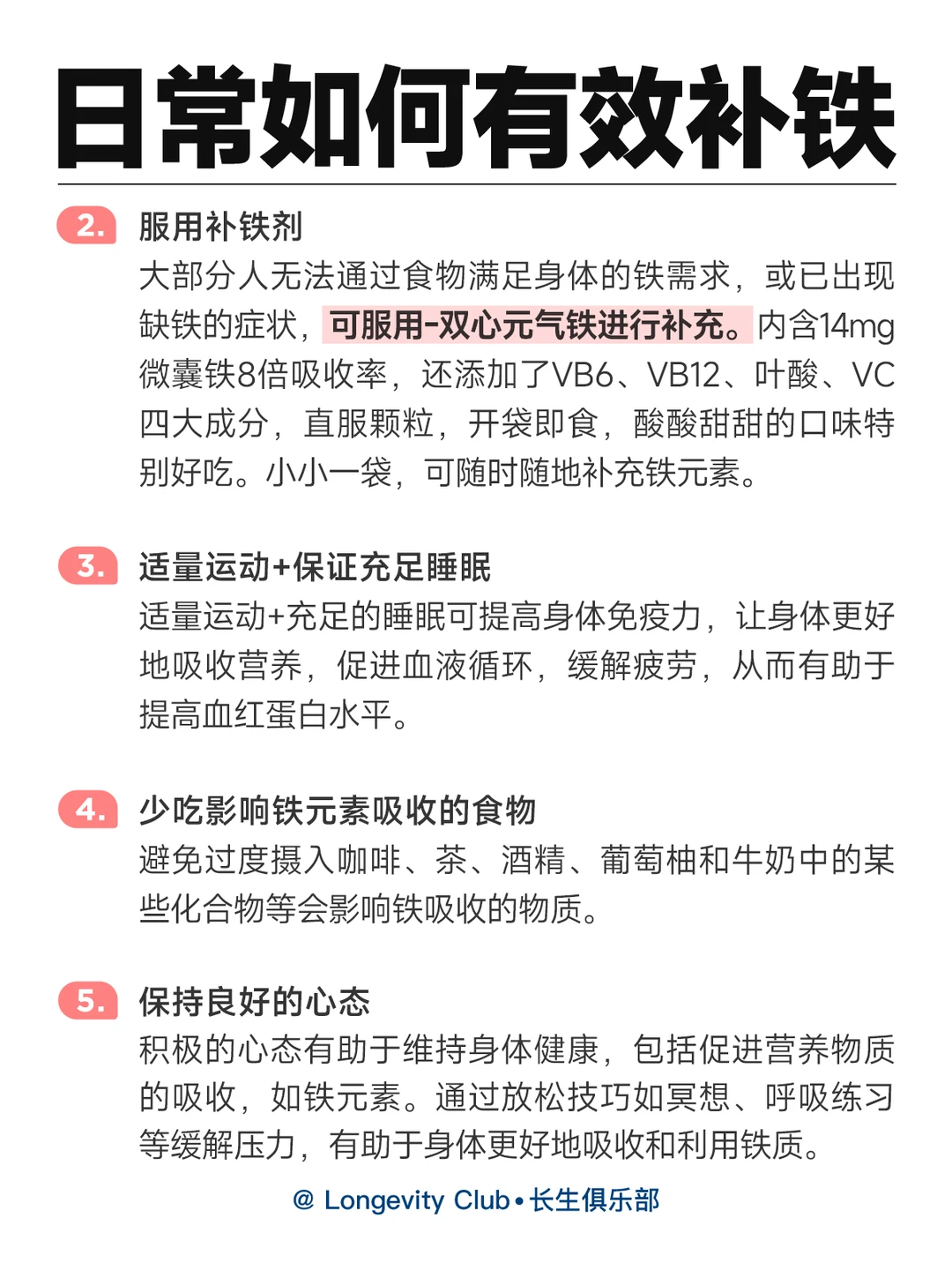 2.服用补铁剂:大部分人无法通过食物满足身体的铁需求,或已出现缺铁的症状,可服用-双心元气铁进行补充。除了内含14mg微囊铁以外,还添加了VB6、VB12、叶酸、VC四大成分,直服颗粒,开袋即食,酸酸甜甜的口味特别好吃。小小一袋,可随时随地补充铁元素。
