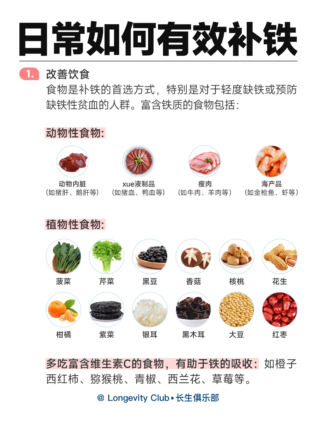 1.改善饮食:食物是补铁的首选方式,特别是对于轻度缺铁或预防缺铁性贫血的人群。帮大家列举了一些补铁食品在图3,大家可以去看看。同时还可以多吃富含维生素C的食物,有助于铁的吸收。
