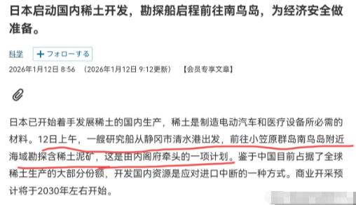 日本态度已明,不会指望中国,日本国内有动作了!1 月 12 日,根据日经新闻报道,就在高市早苗公开表示中国的行为不可接受,管制行为只针对日本之后,日本国内已经有动作了。日媒称,12 日上午,一艘日本研究船从静冈市清水港出发,前往小笠原群岛南鸟岛附近海域勘探含稀土泥矿。 这可不是民间的自发行动,背后是日本内阁府直接牵头的计划,说白了就是国家层面下定决心要自己搞稀土了。 毕竟现在全球市面上的稀土,大部分都是中国生产供应的,日本之前一直依赖进口,现在面对管制,只能赶紧转头挖自己家的资源,生怕以后断了供没的用。 高市早苗那边刚把话说得硬气,这边勘探船就已经驶离港口,这份响应速度确实让人不得不说一句 “够麻利”。 南鸟岛周边这片海域可不简单,日本早就探明这里的海底藏着海量稀土泥矿,保守估计储量得有 1600 万吨,在全球都能排到第三的位置。 更关键的是,这里的稀土里还富含镝、钆这些宝贝,不管是造电动汽车的电机,还是搞核反应堆,甚至是生产先进导弹的关键部件,都离不开这些中重稀土。 之前日本七成以上的稀土进口都来自中国,尤其是这些战略价值极高的中重稀土,几乎全靠从中国买,现在被管制卡住了脖子,自然要急着把自己的储备盘活。 不过挖这海底稀土可不是件容易事,这些含稀土的泥浆藏在海面下 5500 米的深海里,比之前日本在近海试验的深度深了一倍还多。 这次派出去的研究船,要做的就是把专用管道伸到海底,像吸奶茶一样把泥浆抽上来,先验证一下这么深的地方能不能顺利开采。 光是为了这次试采,日本就花了 8300 万美元置办设备,光等管道到货就推迟了好几次,可见其中的技术难度和成本有多高。 日本心里比谁都清楚,稀土这东西是现代工业的 “维生素”,少了它可不行。不管是他们一直大力发展的电动汽车产业,还是心心念念的高端军工制造,从 F-35 隐形战机的雷达,到 “大鲸” 级潜艇的驱动电机,再到正在研发的高超音速导弹,每一样都离不开稀土材料。 之前有数据说,要是中国真的全面断供,日本那些军工生产线几个月内就得停摆,经济损失可能高达两万多亿日元,这可不是小数目,也难怪他们这么着急上火地搞勘探。 这次试采大概要花三周时间,计划采集 35 吨泥浆回来化验,按照估算,每吨泥浆能提取两公斤左右的稀土,算下来这次能拿到的量其实不多,主要还是为了验证技术可行性。 日本的打算是,先通过这次试验摸清门路,2027 年再搞更大规模的钻探,争取到 2028 年之后能实现商业化开采,真正摆脱对进口的依赖。 不过理想很丰满,现实能不能如愿还不好说,毕竟深海开采不仅技术要求高,后续的环保问题、成本控制都是不小的挑战,现在只是迈出了第一步而已。 其实日本早就想着要摆脱对中国稀土的依赖,这些年一直在找替代渠道,但效果并不理想。 一方面是中国在稀土开采、分离提纯领域的技术和产能优势实在太明显,全球八成以上的稀土磁铁都是中国生产的;另一方面,其他国家的稀土资源要么储量有限,要么开采成本太高,远不如从中国进口划算。 现在被管制倒逼,才不得不加快开发本土资源的脚步,这也算是被形势推着走的无奈之举。 高市早苗嘴上说着 “不可接受”,但日本的实际行动却很诚实,知道光靠抗议没用,还是得自己手里有货才踏实。不过这事儿哪有那么容易,从勘探到真正实现稳定生产,中间还有很长的路要走。 且不说 5500 米深海的开采技术能不能稳定落地,就算真的开采成功了,后续的加工提纯、成本控制能不能跟中国竞争,都是未知数。 现在着急忙慌地派船出去勘探,更多的还是一种姿态,想告诉外界自己有应对之策,同时也是给自己国内的产业吃一颗定心丸。 说到底,日本这次的动作,本质上就是面对中国管制的应激反应。之前依赖惯了,现在突然被卡了脖子,只能赶紧转头找自己的后路。 响应效率确实值得一提,刚表态就有实际行动,但后续能不能真正解决问题,还得看技术突破和产业落地的效果。 毕竟稀土产业链的构建不是一朝一夕的事,中国能占据全球主导地位,也是多年积累的结果。 日本想在短短几年内实现自给自足,难度可不是一般的大,能不能如愿以偿,还得让时间来给出答案。