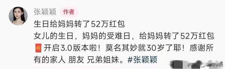 1月12日,是汪小菲前女友张颖颖的30岁生日,张颖颖干了一件事,很令人意外。 张颖颖的生日会,很温馨,有妈妈的陪伴,有很多鲜花和美丽的大蛋糕,张颖颖在庆生的同时,给妈妈转了一个超大红包,52万元。 她写道:“女儿的生日,妈妈的受难日。” 从这件事可以看出: 1,张颖颖是很有钱,52万对她不是大数目,是大红包而已。 2,张颖颖很有孝心,是位懂感恩体贴妈妈的好女儿。 3,张颖颖对家人很大方,是位豪爽之人。 4,张颖颖现在过得很好,被亲情拥抱着,温暖着,日子过得很开心,不因没嫁给汪小菲而落寞。