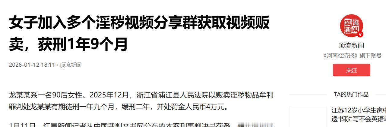 亏大了!浙江,一女子发现,在网上卖小电影可以赚钱,于是把几部完整的电影剪辑成小电影,拉群售卖,结果非法获利36284元,被抓后不仅被判了刑,还罚了她4000元。 龙某一开始的想法特别简单,就是想找个副业多赚点零花钱,她在网上刷到有人靠卖小电影赚钱,看着觉得门槛不高,不用坐班,也不耽误平时的生活,心里就动了心思,在她看来这就是个“低投入高回报”的买卖,只要把东西卖出去,就能轻松拿到钱,完全没意识到背后藏着的风险。 说干就干龙某很快就入了局,她先找渠道收来完整的电影资源,然后自己动手剪辑,把一整部电影拆成一个个碎片化的小片段,这些被剪辑出来的片段,大多是些露骨低俗的内容,她却没当回事只想着怎么卖出去赚钱。 她的售卖方式也很直接,就是建微信群,然后拉人进群交易,定价不算高比如十块钱卖一部片段合集,十五块钱能买两部,看着单个金额不起眼,但架不住买的人多、交易次数密。 她还不甘心只靠自己卖,又兼职做起了“中介”,帮着把买家引到其他类似的分享群组,从中收取几十到一百多块不等的介绍费。 就这么一点点累积,五年时间里,龙某靠这套流程竟然攒下了不少钱,非法获利足足有36284元。她当时肯定觉得自己找对了路子,殊不知这些看似“轻松”赚来的钱,早就给自己埋下了祸根。那些她以为“你情我愿”的交易明细,后来全成了法庭上定她罪的铁证。 比如有一次她把五部电影拆成了56段,打包卖30块钱,其中44段都被鉴定为淫秽内容,还有一次更过分,16部影片被她切成109个片段,标价118元,里面103段都是淫秽视频,这些带着明显违法性质的交易,每一笔都被记录得明明白白,等警方找上门的时候,她想抵赖都没机会。 被抓之后龙某倒是挺配合,办案人员问什么她就交代什么没有隐瞒,之前赚的36284元赃款也全数退缴了,但即便如此,也改变不了她违法犯罪的事实,法院经过审理,认定她构成了贩卖淫秽物品牟利罪,考虑到她认罪态度好,还主动退了赃最终给了她缓刑的机会,刑期是一年九个月,缓期两年执行。 可缓刑不代表没事,除了刑期挂在身上,她还得实打实掏4000元的罚金。这么一算账就清楚了,之前赚的36284元全被收缴,一分没剩还得自己从腰包里掏出4000元交罚金,等于不仅没赚到钱,还倒贴了4000块,更要命的是“犯罪”这个污点,从此就钉在了她的人生履历上,以后不管是找工作、考证书,还是其他需要政审的事情,都会受影响。 很多人可能会纳闷,不就是在网上卖点东西吗?买卖双方都愿意,怎么就成犯罪了?其实关键不在于“卖东西”这个行为,而在于她卖的东西本身,只要交易的标的被认定为淫秽物品,传播和售卖就直接踩了刑法的红线,价格高低、是不是自愿交易,都改变不了这种行为的违法性质。 现在网上总有人用暗示性的话术,把这种买卖包装成“低风险高回报”的副业,忽悠那些想“顺手赚零花钱”的人,但龙某的遭遇已经明明白白告诉大家,所谓的“门槛低”是真的,可背后的代价却大到让人承受不起,网络空间从来不是法外之地,那些在线下被严格管控的淫秽内容,换个平台传播依然是违法的。