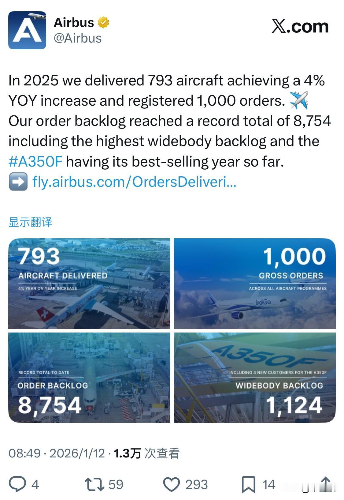 空中客车公司在2025年实现了793架飞机的交付,略高于其修正后的目标,并且订单积压量达到了创纪录的8,754架。 2025年业绩概览 飞机交付量: 2025年共向全球91家客户交付了793架商用飞机,同比增长4%。 总订单量: 获得1,000架新飞机的总订单,净订单量为889架。 订单积压: 截至年底,总订单积压量达到创纪录的8,754架飞机,其中宽体飞机积压量为1,124架,也创下了新高。 A350F货机: A350F机型在2025年迎来了四家新客户,并且是其迄今为止最畅销的一年。 空中客车尽管面临复杂的供应链环境,仍成功超额完成了其修订后的交付目标(原目标约为790架),显示了强劲的市场需求。