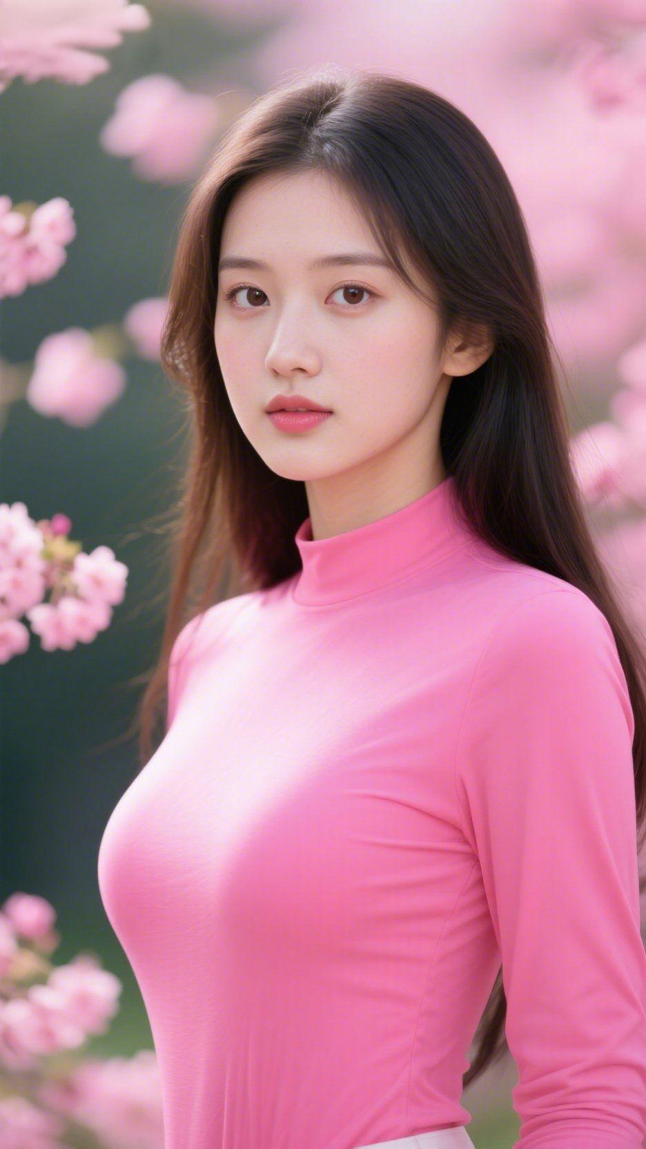 粉衫伴樱裹春柔 樱瓣揉软风色时,她立在花影间。绯色衣身裹着舒展的温婉,高领衬得肩线轻缓,长发垂落如流云轻淌——似将春晨的柔,织作了衣间的温。 目光轻落处,眼底浸着溪涧般的明。衣料裹着温软气息,像铺开一页浸了花味的笺:是粉的柔裹着樱的淡,是光的暖融着风的轻,是时光在此刻放缓的,恰好安然。 无需冗余装饰,这抹粉落进樱丛里,便让周遭浸了春。原来舒展的美从非夺目,是恰好的色调、恰好的花影,和恰好栖在眉眼间的,半缕春光。 粉衫春樱雅韵 春日穿搭温婉