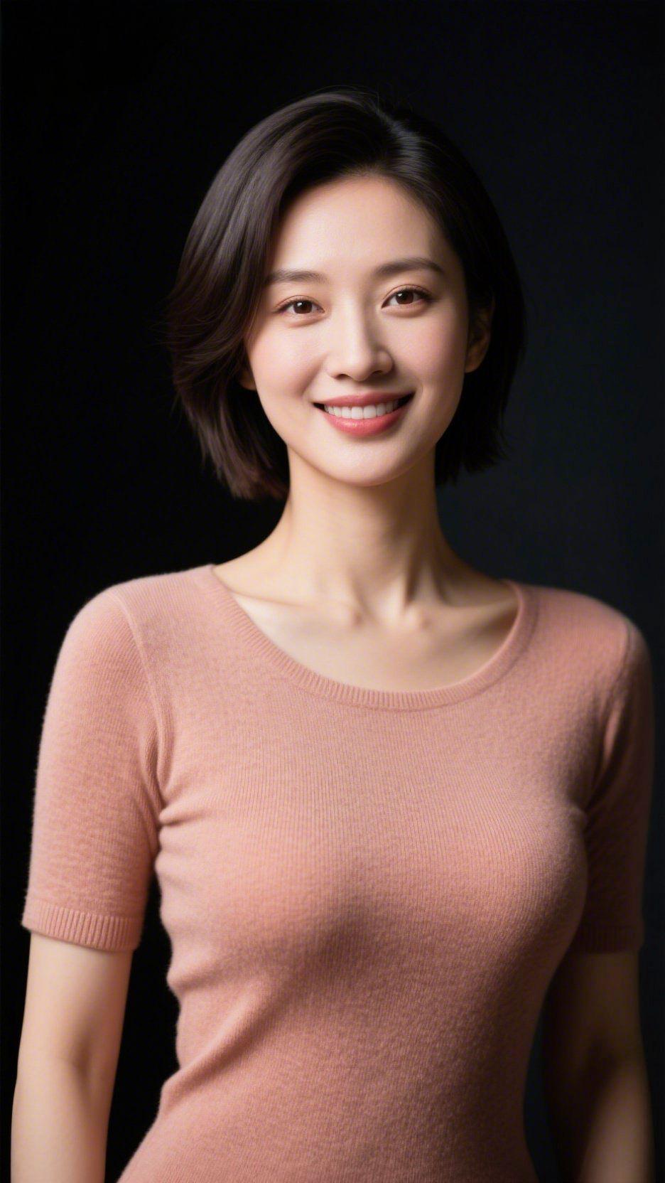 暖粉柔光裹清宁 沉暗的底色间,她立于轻缓的光里。暖粉衣身裹着舒展的温婉,针织纹理漾着轻软的质感,短发垂落的弧度带着风的浅痕——似将春晨的柔,织作了衣间的温。 笑意舒展时,眼底浸着溪涧般的明。衣料裹着温软气息,像铺开一页浸了暖调的笺:是粉的柔裹着笑的净,是光的淡融着影的轻,是时光在此刻放缓的,恰好安然。 无需冗余修饰,这抹暖落在暗里,便让周遭浸了温。原来舒展的美从非夺目,是恰好的色调、恰好的姿态,和恰好栖在眉眼间的,半缕柔光。 暖粉穿搭的雅致 暗境里的清宁