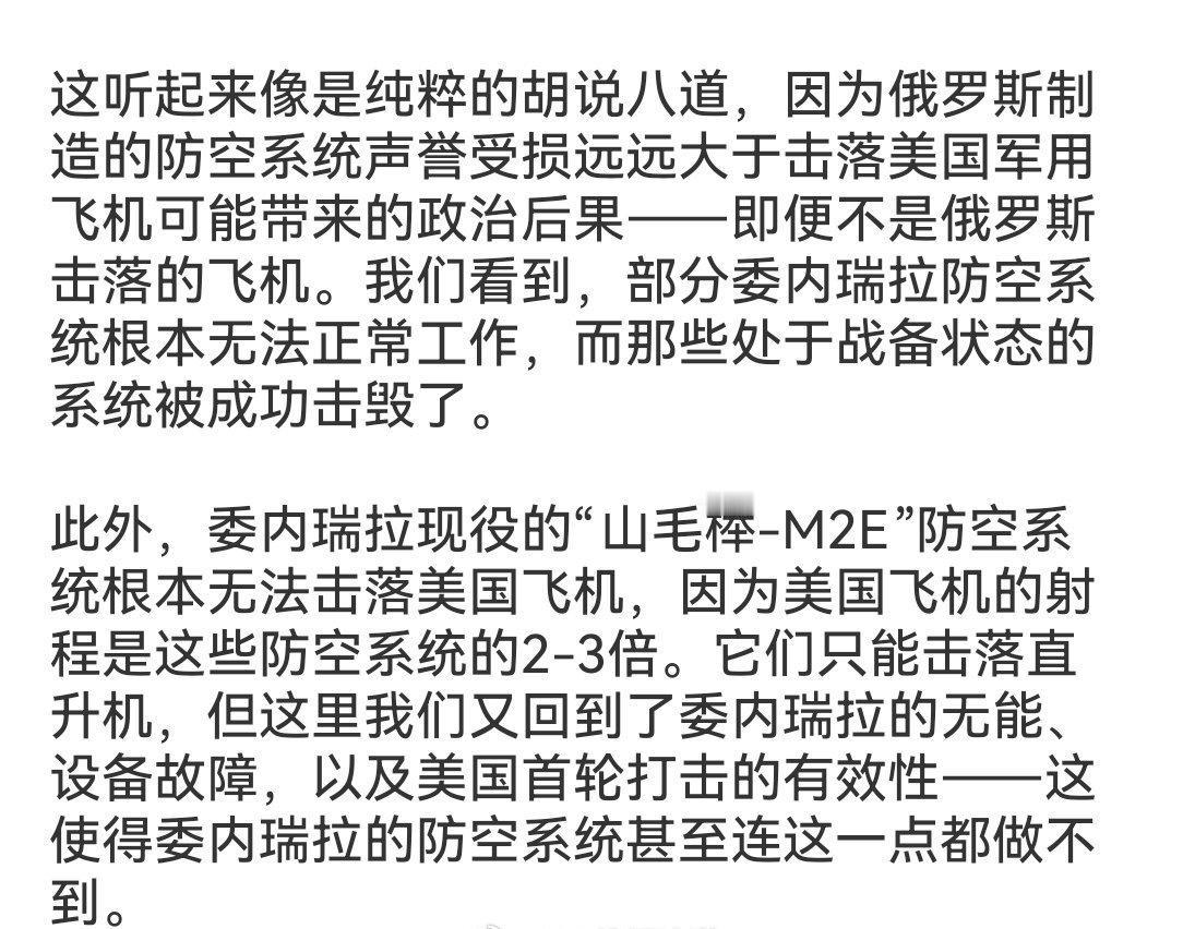 美国《纽约时报》指出了委内瑞拉在美国入侵面前变得脆弱不堪的原因。 委内瑞拉在维护俄制装备方面遇到了困难:该国不仅缺乏维护或操作军事装备的零部件,也缺乏相应的技术知识。此外: ▪️委内瑞拉无法维护和使用S-300和“山毛榉”防空系统; ▪️部分防空系统未与雷达连接; ▪️部分防空系统在袭击发生时仍储存在仓库中,且已多年无法正常运行。 ▪️还有一部分防空系统在美国空军的空袭中被击毁,部署位置包括拉瓜伊拉港口、拉卡洛塔空军基地和伊赫罗特机场等。 美国中央情报局驻委内瑞拉站前站长、目前在华盛顿经营着一家Tower Strategy游说公司的理查德·德拉托雷表示:“经过多年的腐败、糟糕的后勤保障和制裁,委内瑞拉的防空系统无疑已经降低了战备水平。” 《纽约时报》总结道,委内瑞拉军方的无能对美国行动的成功起到了很大的作用,尽管美国方面数月来一直在发出威胁,但委内瑞拉军方还是被美国的行动打了个措手不及。 该报声称俄罗斯故意让委内瑞拉的装备失灵,以避免因俄制防空系统击落美国飞机而引发与美国的严重冲突(有俄罗斯信源反驳了这点,图二)。