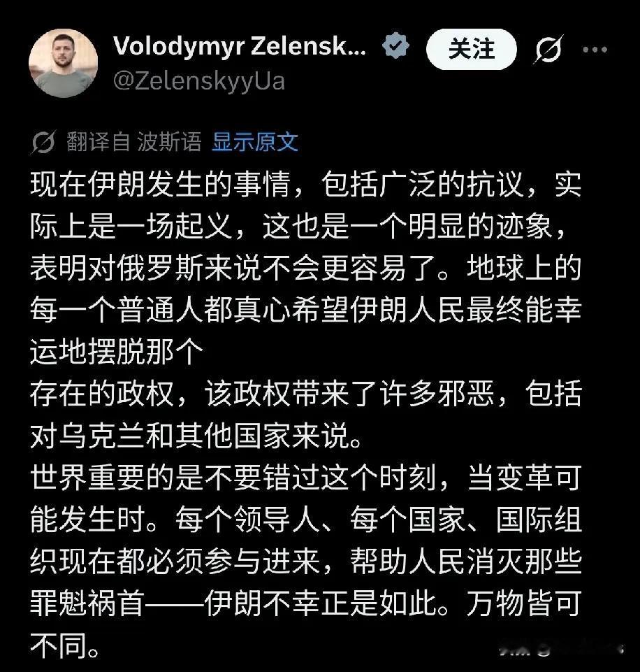 泽连斯基用波斯语发文,声援伊朗人民: 现在伊朗发生的事情,包括广泛的抗议,实际上是一场起义,这也是一个明显的迹象,表明对俄罗斯来说不会更容易了。地球上的每一个普通人都真心希望伊朗人民最终能幸运地摆脱那个 存在的政权,该政权带来了许多邪恶,包括对乌克兰和其他国家来说。 世界重要的是不要错过这个时刻,当变革可能发生时。每个领导人、每个国家、国际组织现在都必须参与进来,帮助人民消灭那些罪魁祸首——伊朗不幸正是如此。万物皆可不同。