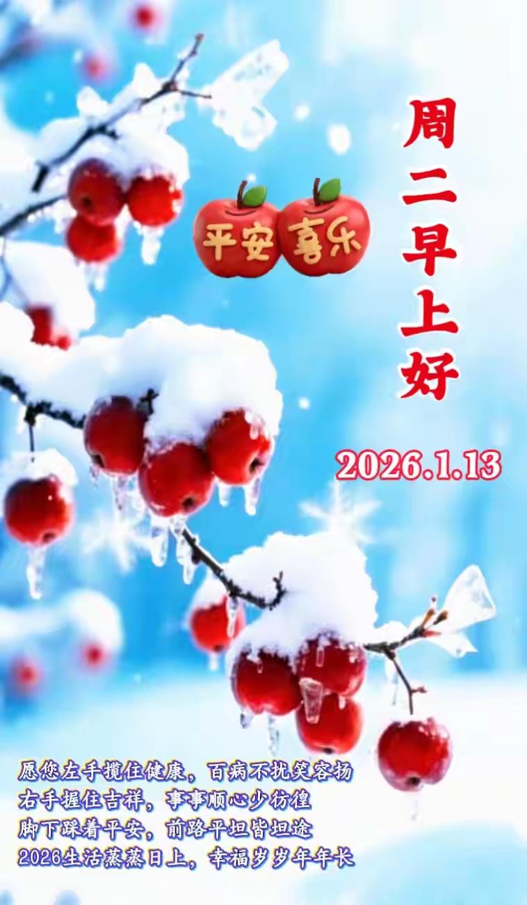 [2026.1.13]周二,愿您冬日无恙,福寿安康,诸事顺意,喜乐康宁! [玫瑰][招财进宝][福]早上好![大笑][锦鲤到来][祈祷]
