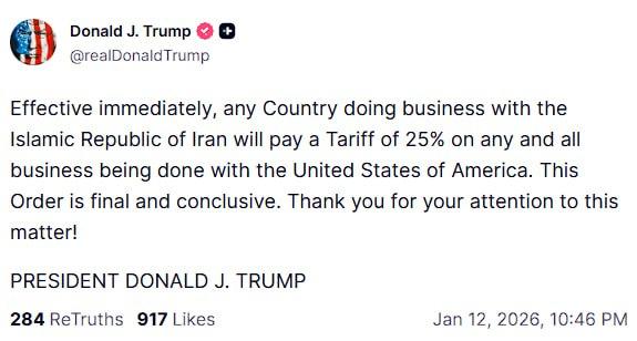 1月13号,特朗普突然宣布将对伊朗所有的贸易伙伴征收25%的额外关税。那么如何评估特朗普这个政策所带来的影响?它会给本已稳定的中美经贸关系带来新的冲击吗? 首先,这项关税措施本质上是典型的“以压促变”策略,通过经济孤立迫使伊朗政权内部发生变化,与特朗普此前对俄罗斯和委内瑞拉的“二级关税”高度相似。当前伊朗正面临全国性抗议浪潮、通胀失控,特朗普宣布“即刻生效”的25%关税,旨在放大伊朗内部矛盾,进一步加深伊朗经济困境,扩大伊朗在地区的孤立地位,制造“政权更迭”条件。 第二,从伊朗主要的贸易伙伴角度出发,此次二级关税针对中国的意图明显。目前,中国是伊朗最大的贸易伙伴,占伊朗出口约25-36%、进口约26-34%,主要涉及石油、机械设备和化工品;其次是阿联酋、土耳其(约10%)、印度、伊拉克和巴西等。这条25%关税名义覆盖全球,但实际杀伤力大部分指向中国。如果严格执行,中国对美出口商品将额外加征25%,相当于变相全面贸易战升级;其他伙伴规模小、易规避或妥协,因此中美在伊朗问题上的博弈,有可能成为下一阶段的重点。 第三,那么它对当前中美经贸关系,尤其是4月特朗普访华有什么影响和冲击呢?实际上,从过去美国的套路来看,它本质上还是特朗普凭空制造新筹码,迫使中国重回谈判桌。2025年底以来中美贸易摩擦有所缓和,特朗普已计划4月访华,但现在突然抛出“伊朗关税”炸弹,本质上是在访华前夕加码施压。这恐怕将迫使中美经贸团队在2月或3月,围绕伊朗的关税问题,再次进行一次经贸磋商。美国可能会以暂缓伊朗关税为筹码,要求中国在芬太尼、农产品采购、对美投资等问题上,做出新的让步。 最后,美国开始转向对伊朗的经济施压,似乎意味着短期之内伊朗军事风险的暂缓。实际上伊朗现在的主要价值,又变成了美国同中国进行战略博弈的一个筹码。因此在下一轮的中美经贸磋商,或者是4月份的特朗普访华之前,美国在伊朗动手的可能性显著下降。这本质上也反映出了美国和以色列在看待伊朗时的显著差异,以色列把伊朗看成是生存威胁,而特朗普则始终把伊朗看成是谈判和交易的筹码。打与不打,取决于如何能让伊朗的价值最大化。
