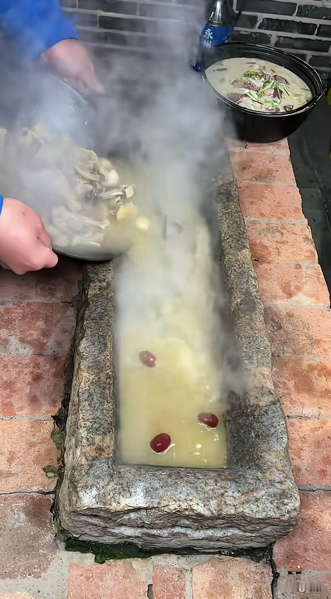 万万没有想到!石槽火锅确实是别出心裁!石槽,一种长方体石头槽子,在过去生产队时期,经常用来盛料喂牛、马、驴、骡,猪等动物的器具,在今天又焕发了青春!当然,人用的石槽比以前小很多,人的饭量怎么能和这些动物相比? 在天寒地冻的季节里,几个狐朋狗友一起吃上一顿火锅,那该是多么的美妙!一锅热气腾腾的火锅做好了,由厨师端着走到一个洗的干干净净的猪食槽子那里,先用一个大舀子舀到石槽子里一些,等锅里的汤少点了的时候,再全部倒进石槽子里,然后手里的舀子挥了几下,那一帮男女就像饿狼似的冲了上来,各自把汤肉舀到碗里,津津有味的吃了起来。这么些人围着一个石槽一起吃,真是别有一种意境,更有一种奇特的味道!真是难以言表!妙不可言! 现在的大多数人,干着繁重的活,拿着徽薄的工资,整天忙忙碌碌,累死累活,钱也没有多挣!很多打工人自己戏称自己为“牛马”,“牛马”当然有牛马的一种生活,石槽火锅果然不负众望,昂然出世,令人发指的是它竟戳中了很多人的痛点,让人跃跃欲试,一试之后,欲罢不能!石槽火锅最懂“牛马”! 有人以为,人己经脱离了动物界,成了文明一簇,动物用过的食具,人岂能用?这有什么,洗干刷净,也不觉得怎么排斥!以前有人把煮熟了的水饺倒在桌子上吃,现在又有人把火锅倒在石槽中吃有什么不可以?都是“师兄弟”啊!寇可往,我亦可往! 在我们国家,美好的发明者和污暗的发明者都没有上线和下线的!哎!