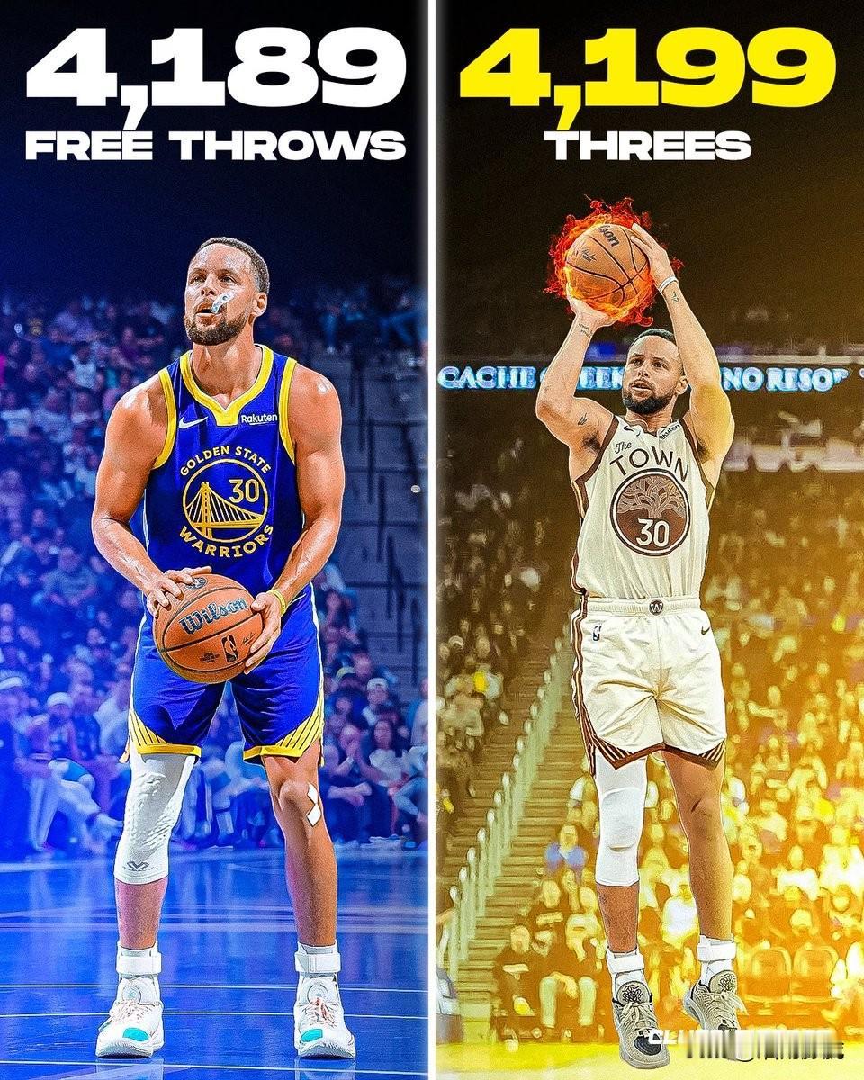 三分球命中数比罚球命中数还要多,恐怕能做到的球星只有库里了吧! 美媒也在讨论库里职业生涯三分球命中数比罚球命中数还多这件事。仔细想想,这完全说不通。NBA历史上大多数超级巨星都靠罚球得分,但库里却反其道而行之。 这是篮球运动员最纯粹的统计数据。为了更直观地理解这一点,对比看看哈登就知道了。哈登本身就是一位传奇人物,他投进3288个三分球,但他的罚球命中数更是惊人,达到了8432个。哈登基本上是在罚球线上建立了自己的帝国,而库里则决定在罚球线上从不失手。 我们正在见证一位独一无二的球员的职业生涯。我们还能再看到另一位超级巨星在联盟生涯结束时三分球命中数比罚球命中数还多吗? 感觉我们正在见证一项纪录,这项纪录可能比4000个三分球本身还要难以打破🤷♂️